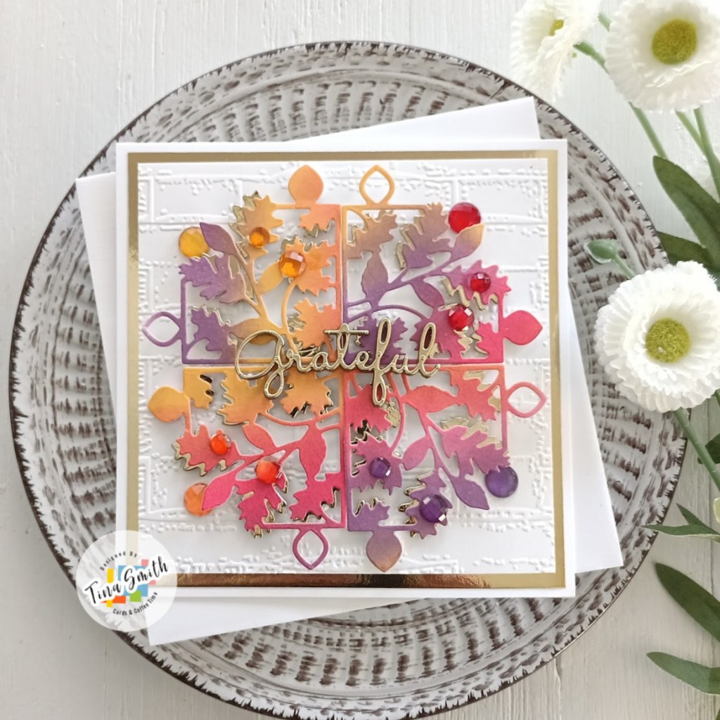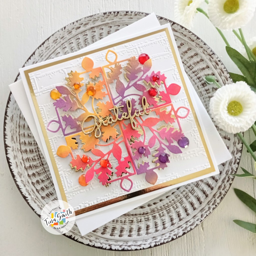 Hello and Happy Thursday Crafty Friends! Today I am sharing a card made with the Spellbinders Small Die of the Month Club kit for October 2020 I love the stunning square shape with fall leaves die that came this month….so stunning!!! The name of this die set is called Fall Leaves Card Creator. This month there are 8 cutting die with leaves to accent the pretty frames along with three sentiment dies in a beautiful font! I usually like to create a card with the first impression that I get when I look at the club kit. This month I thought wowza! This would make a pretty square card with lots of glam! I love how it turned out & I hope you do too!