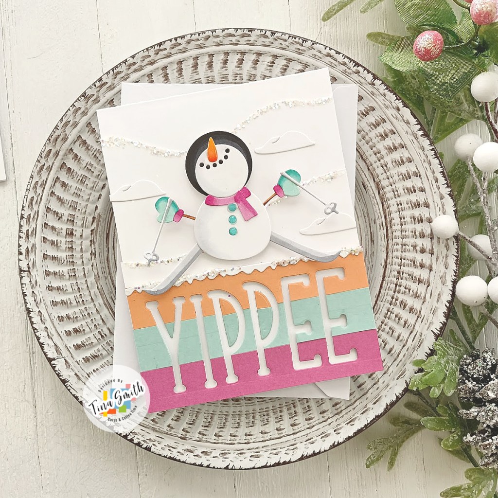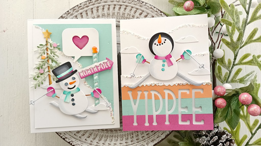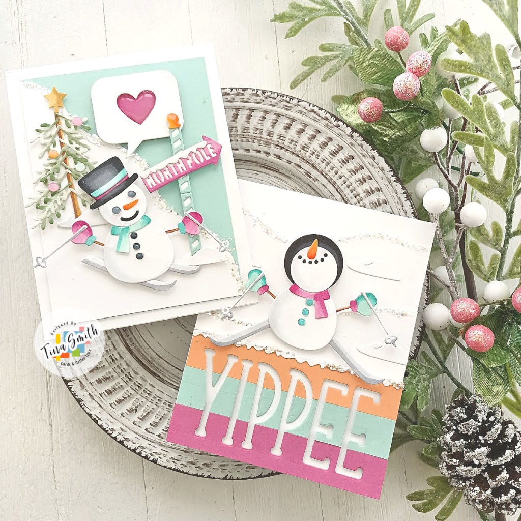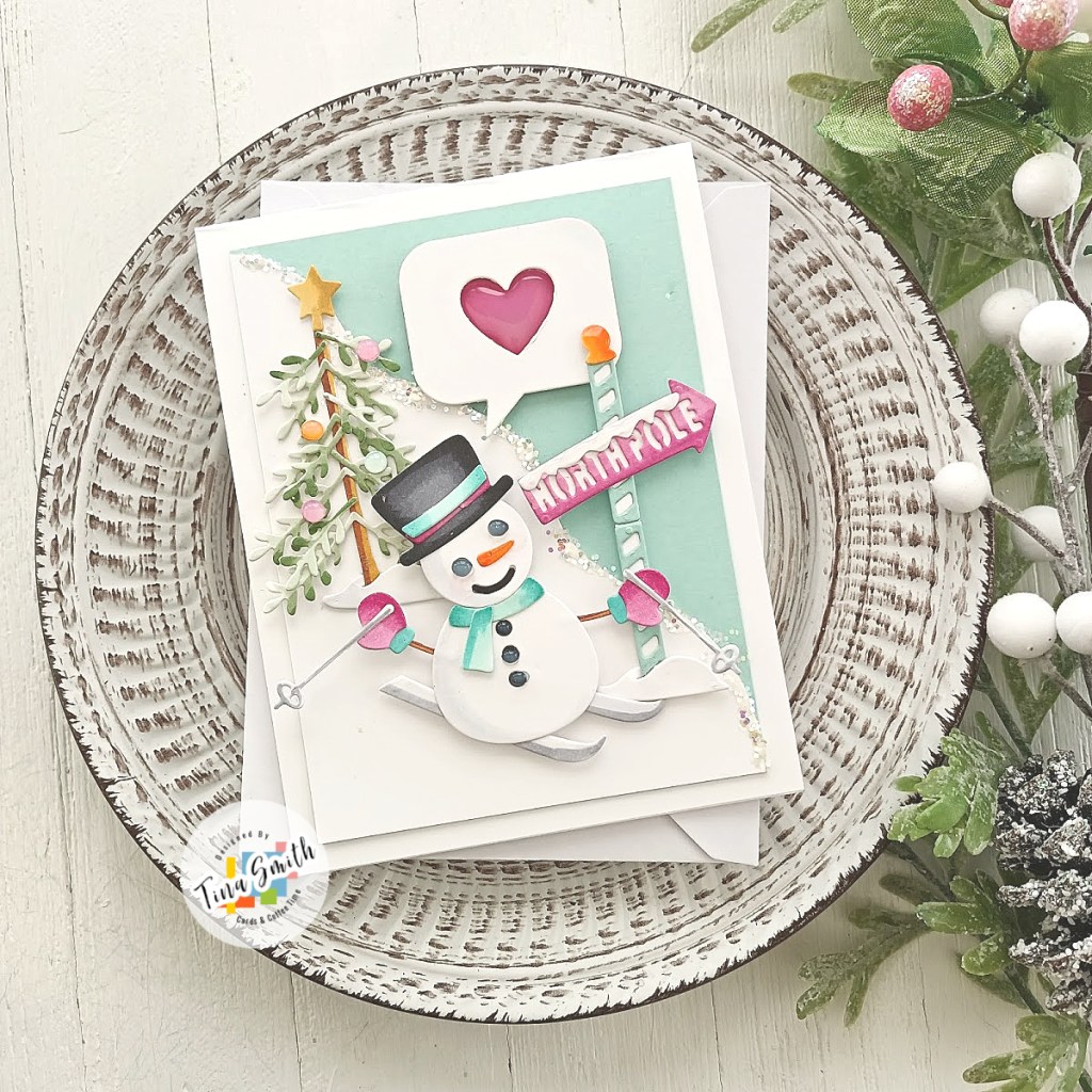 I love the adorable skiing snowman images that came this month….so stinkin’ cute!! The name of this die set is called Frankie Goes to the North Pole. It has 20 dies including scene building elements that include a tree and a North Pole sign, how fun!!