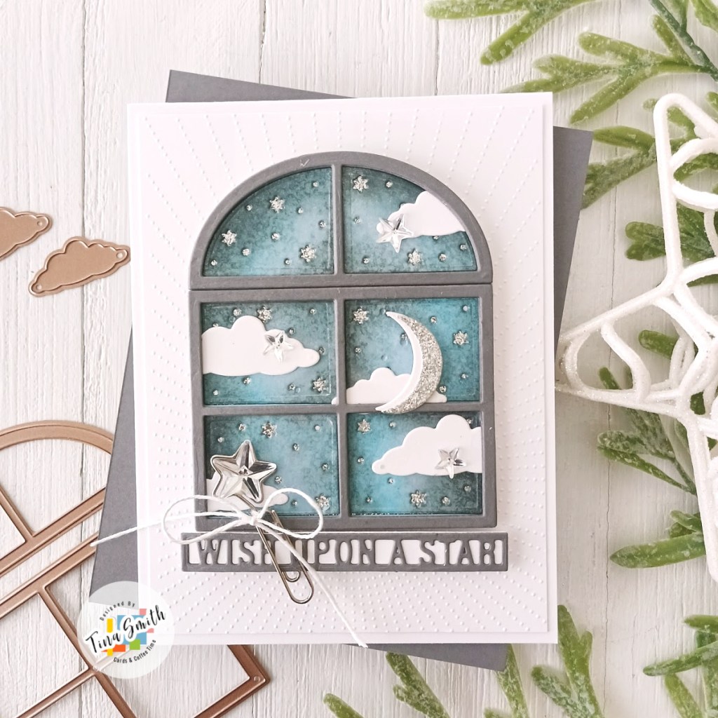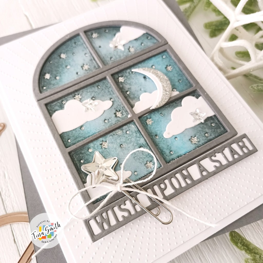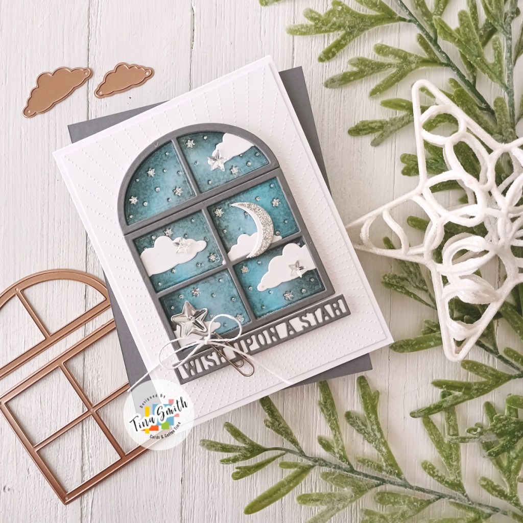 This month the Day Dreaming set has 17 Cutting Dies and creates the perfect A2 size window scene. There are playful accent images like a cat, moon, tree, and clouds. I love how the sentiments fit perfectly in the windowsill:)