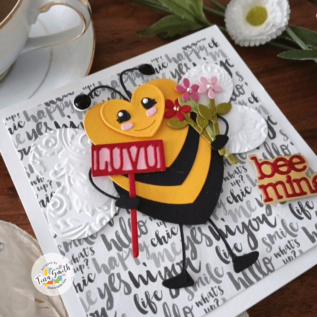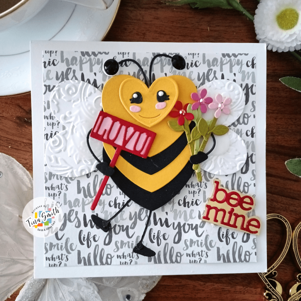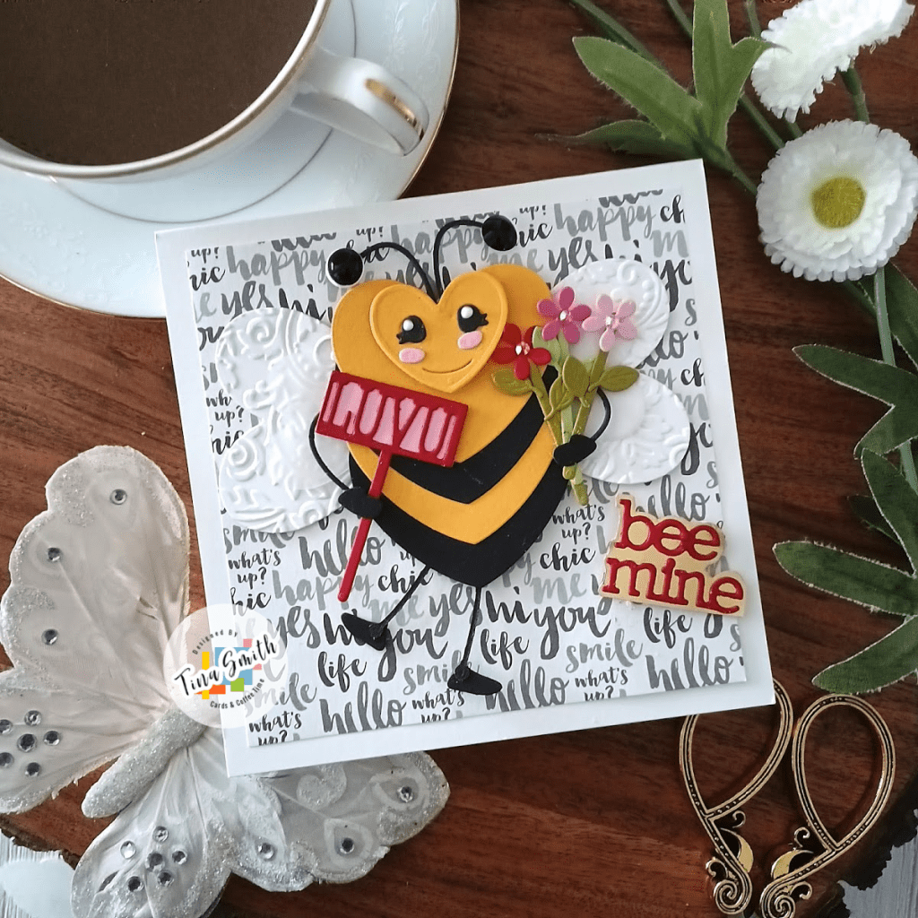Hello and Happy Thursday Crafty Friends! Today I have been invited to share with you a brand new die set from Spellbinders that will make you smile! This is the Dancin’ Hearts Etched Dies from Expressions of Love Collection. This collection features 15 Dies for creating fun valentines that are interactive. The card I made today is a 5-1/4 x 5-1/4 card with a Dancin’ Bumble Bee, yes I just used the same die set:) Don’t you love the versatility!! I love how it turned out:)