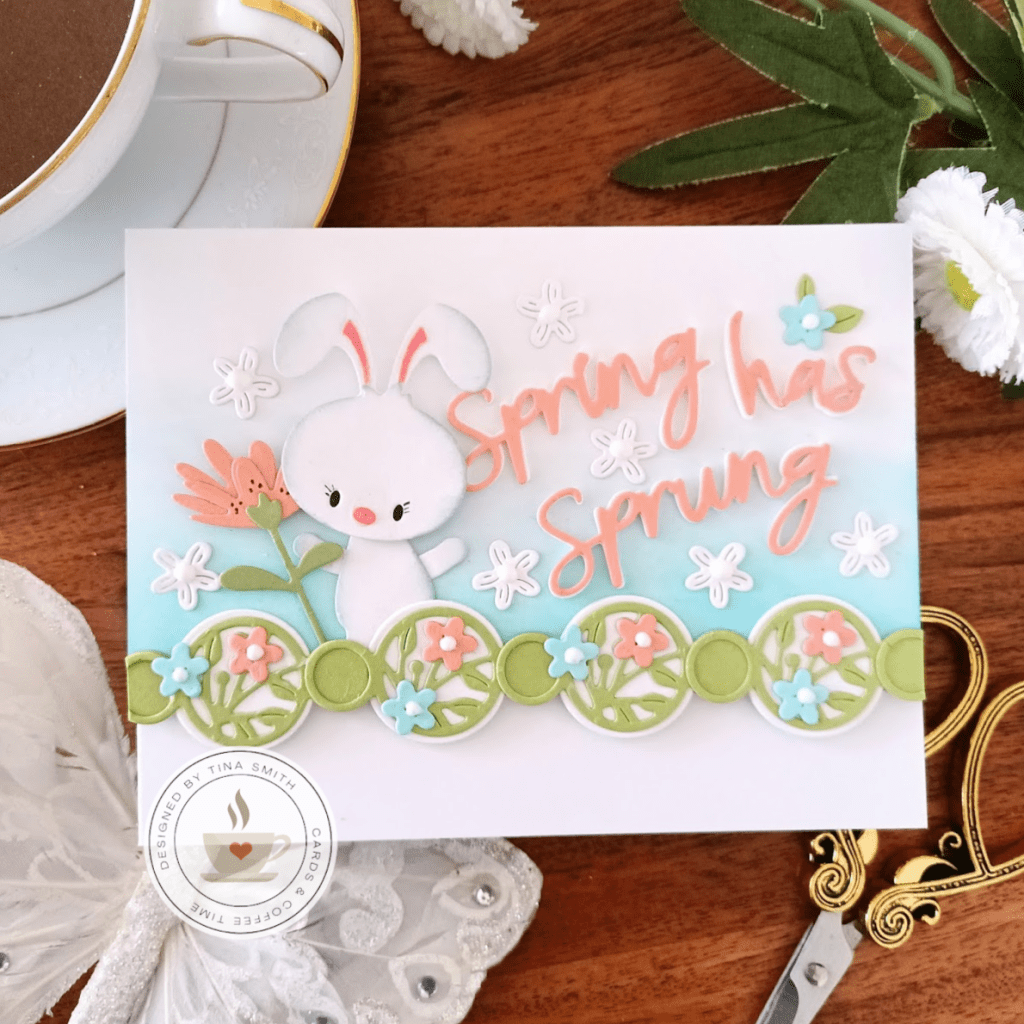 This month the Spring Flowers Card Creator set has 13 Cutting Dies and creates a lock & key floral panel frames so when you die cut two, you can basically join them together at the circle points:) Neat Huh! I also love the delicate spring flowers in this months die set and there is a sentiment in there too, Spring has Sprung! I created a bunny from the Large Die of the Month Club Kit and it went perfectly with the border I created!