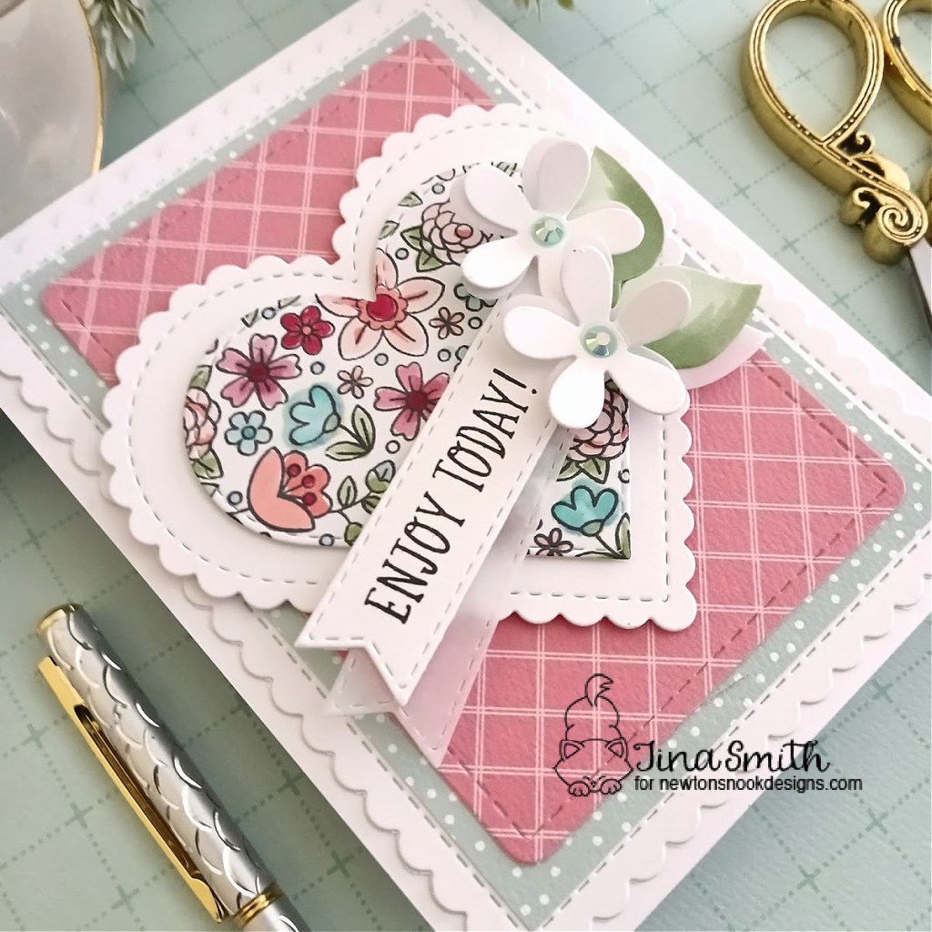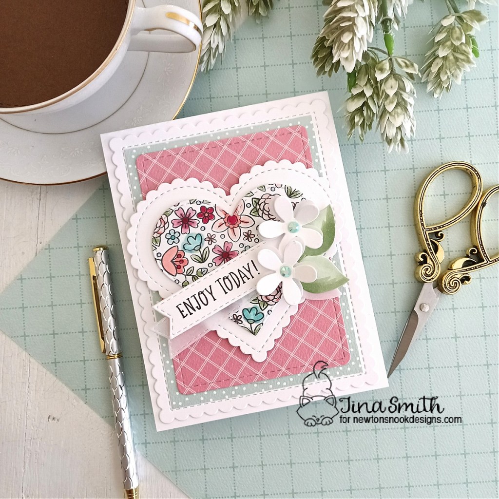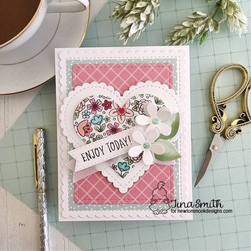 I colored my image from the Heartfelt Blooms Stamp Set in with copic markers and die cut it out with the Heart Frames Die Set. I stamped the “Enjoy Today” sentiment and die cut it out with the Banner Trio Die Set. I created a layered patterned paper background with the Frames and Flags Die Set for my card and love the way it turned out. For a bit of added interest I did add a few flowers and leaves from the Slimline Frames and Portholes Die set. I hope you get a chance to visit the Newton’s Nook Design’s Shop to check out all the amazing release!