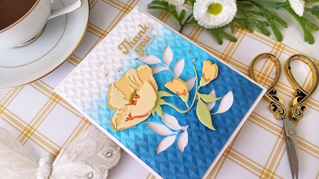 This is an amazing card and I like the blues and the yellow hues! Such a great idea with the embossed ombre blue background! MARVELOUS!!!!
