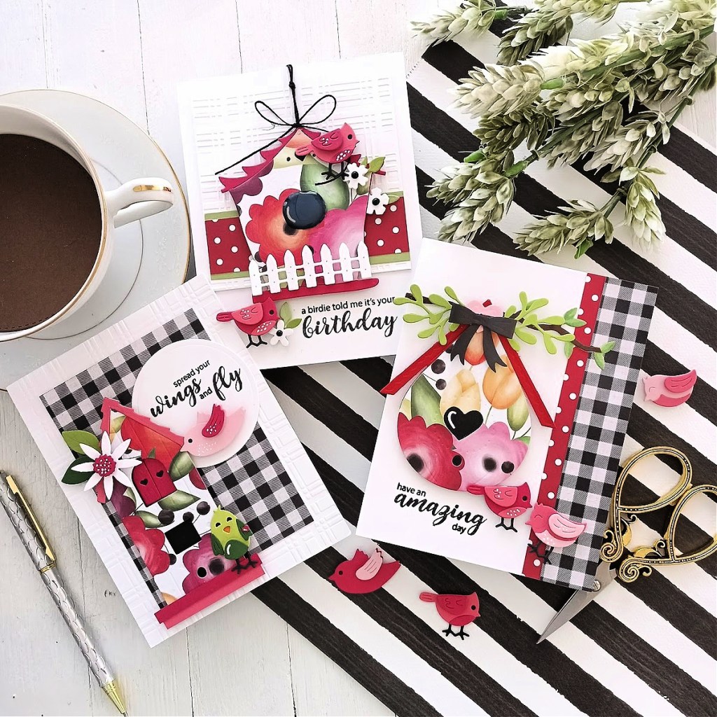 Today I am creating three cards with the Build a Winter Birdhouse Die Set, Build a Spring Birdhouse Die Set, Build a Fall Birdhouse Die set, the Sweet Birds on a Branch Die set and the Tweet Sentiments Stamp. Each of these Birdhouses have a season to them but I wanted to show that there are elements of the die sets that can be used for many other occasions too! I love using patterned paper and loved the florals in the Sunday Adventure 12×12 Paper Pack. They reminded me of watermelons, that was the color theme I went for. I believe this pack is no longer available but using any larger floral print would create the same effect.