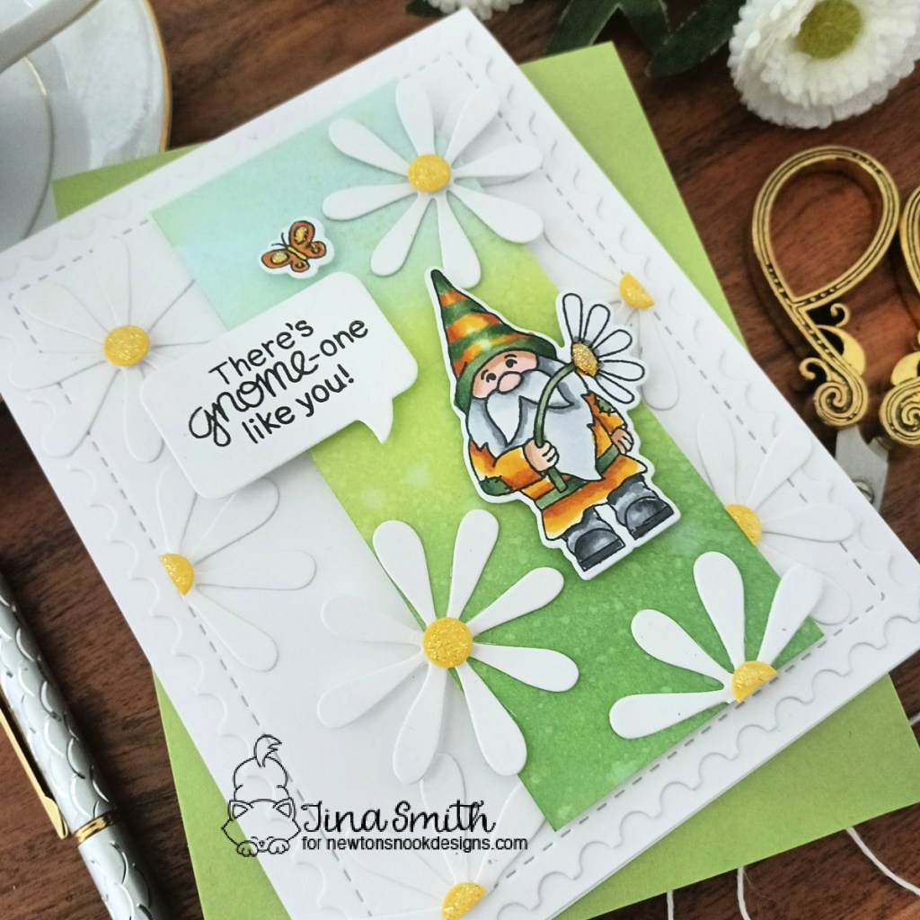 I colored my image from the Gnomes Garden Stamp Set with copic markers and die cut it out with the Gnome Garden Die Set. I stamped the “There’s Gnome-one Like You” sentiment on a speech bubble die cut with the Speech Bubble Die Set. I created a flowery daisy background with the Flower Trio Die Set and ink blended with a few of my distress oxide inks. I love this adorable little gnome and love the way it turned out. For a bit of added interest I did add a background panel created with the Framework Die set. I hope you get a chance to visit the Newton’s Nook Design’s Shop to check out all the amazing release!
