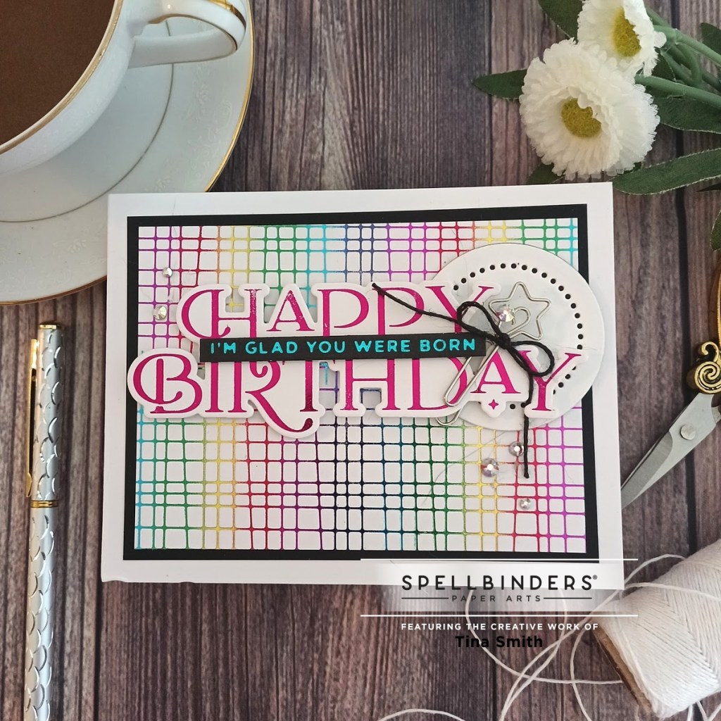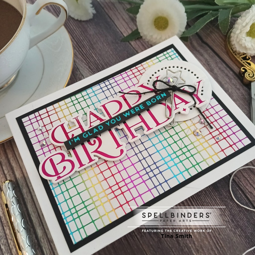 Hello Crafty Friends! Today I am sharing a project with the Spellbinders Glimmer Hot Foil Kit of the Month Club. If you love the Glimmer Hot Foil System this club kit subscription is perfect!! The JUNE 2021 kit is called Sweet & Snarky Birthday Wishes! It has one half large Happy Birthday glimmer plate that is in a fancy Block font. It will fit an A2 card. a Mini Slimline cards and a regular Slimline card beautifully landscape style. There are 6 secondary sweet and snarky sentiments too:) Plus a sentiment strip die for all 6 of the fun sentiments in this set. This month the foil roll is the pretty Aura that I love but used rainbow colored foils from my stash for today’s card! I love the way it turned out and hope you do do:)