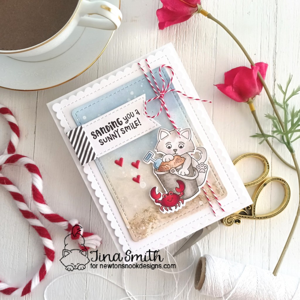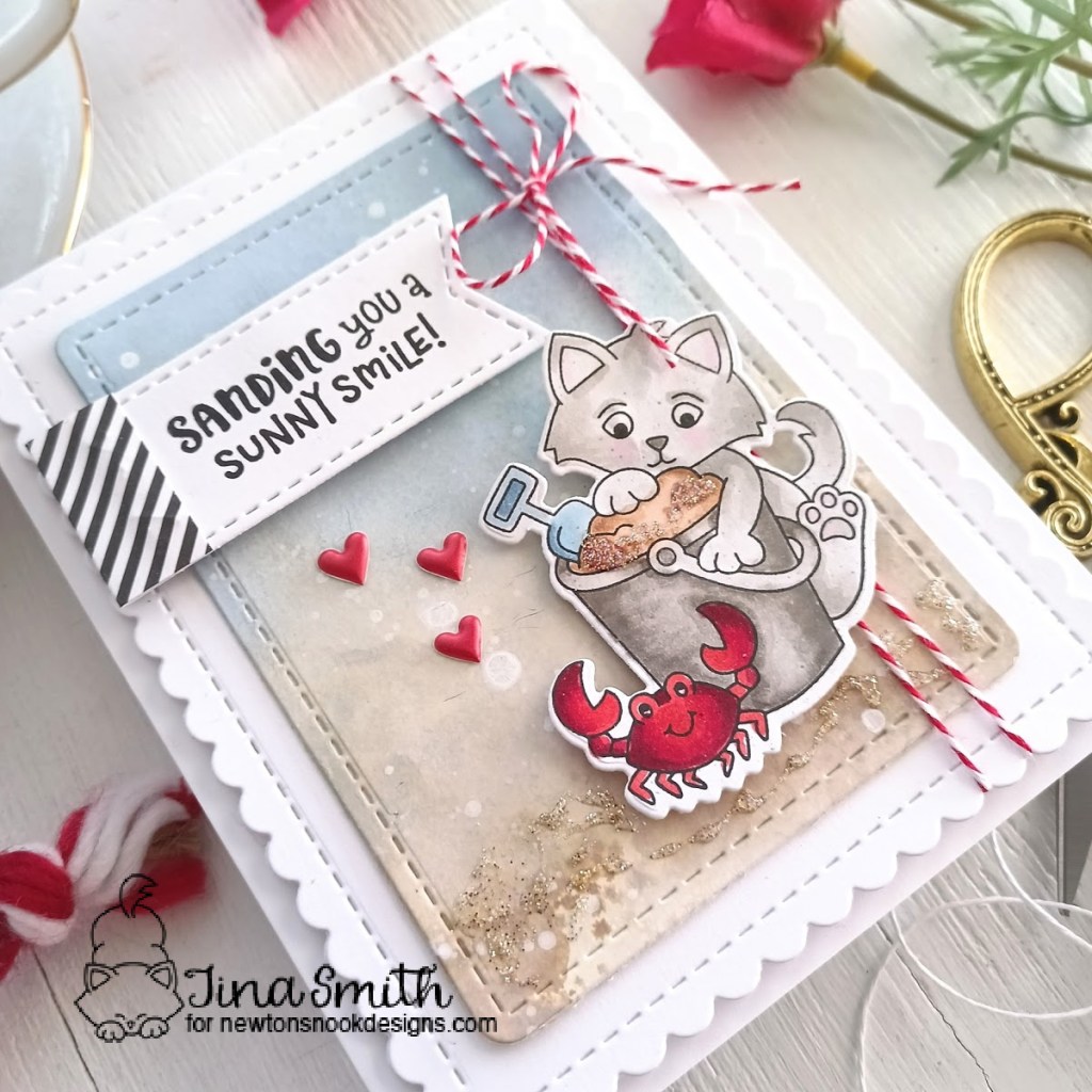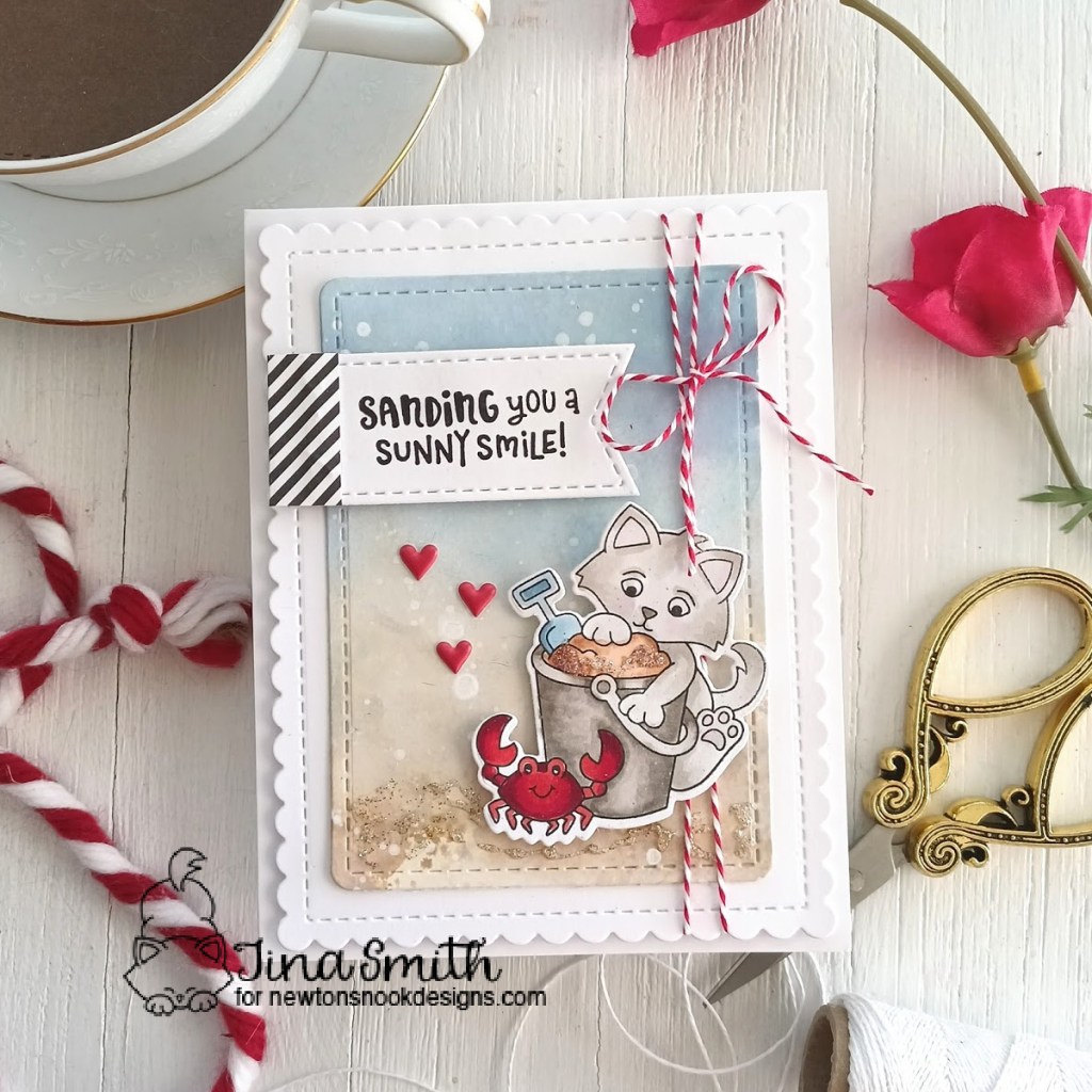 I colored my image from the Kitten Beach Stamp Set with copic markers and die cut it out with the Kitten Beach Die Set. I stamped the “Sanding You a Sunny Smile” sentiment on a banner die cut with the Frames & Flags Die Set. I created a Distress Oxide Ink Blended background on white cardstock and added white spatter to it for softness.. I love this adorable beach themed set and love the way it turned out. I hope you get a chance to visit the Newton’s Nook Design’s Shop to check out all the amazing release!