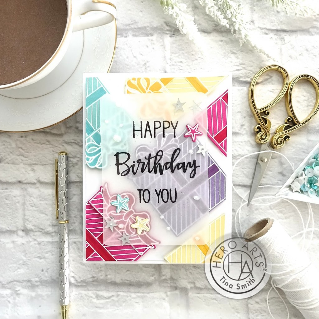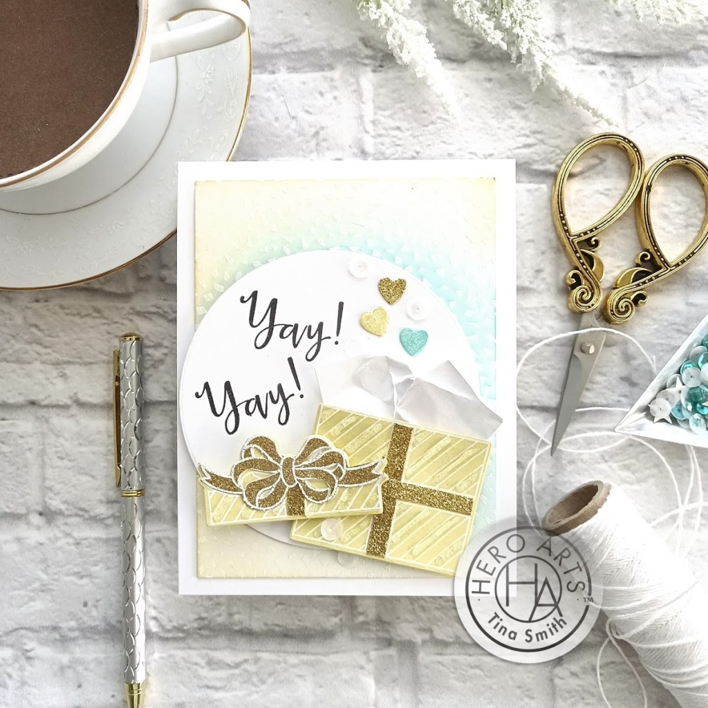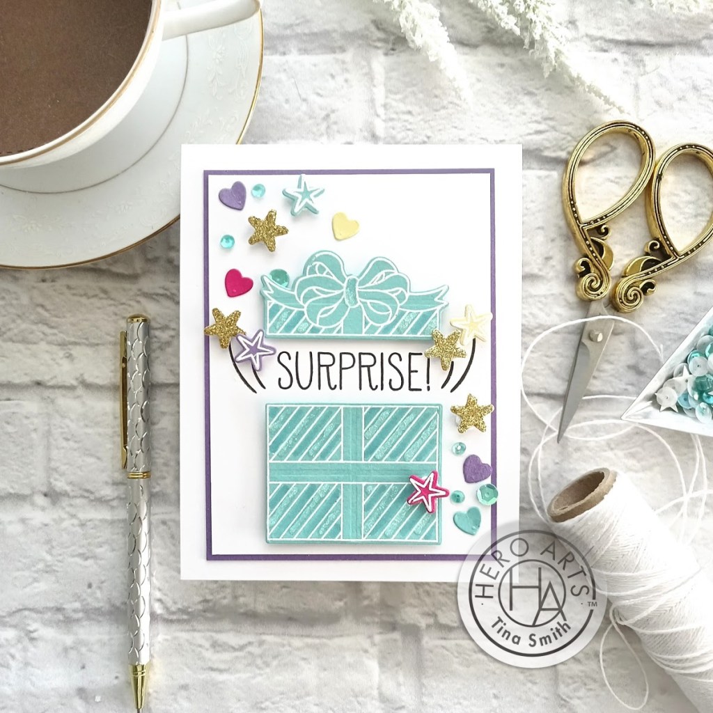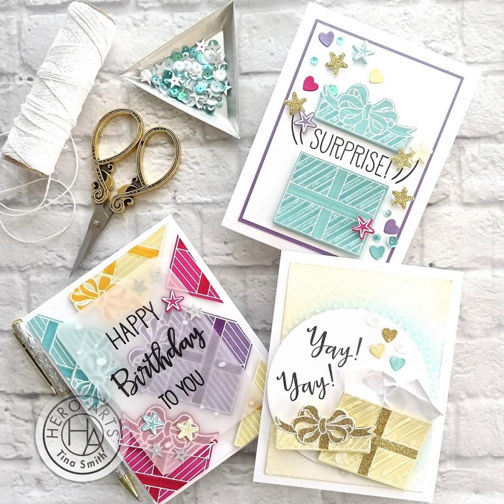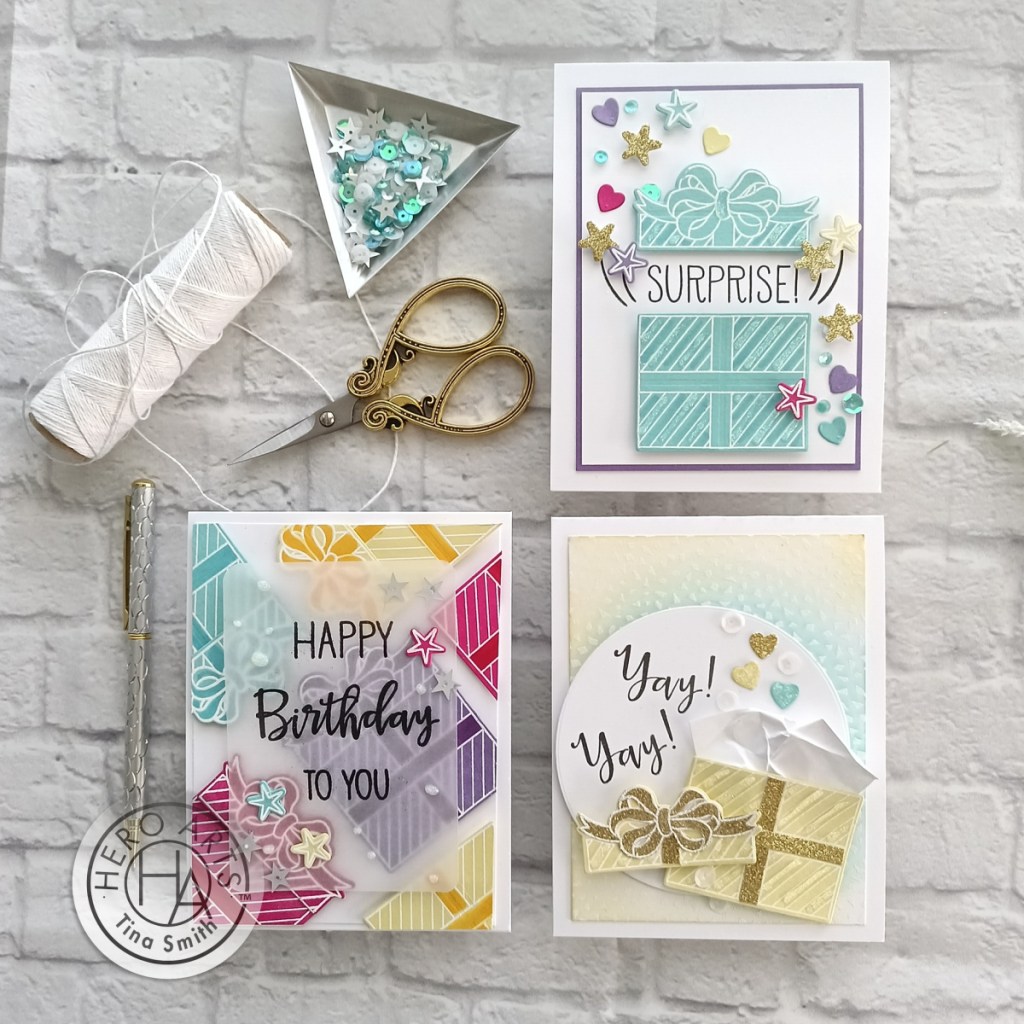 I created 3 cards with a Birthday Gift theme that are perfect for everyone!! The sentiments coordinate with the images and will make anyone smile! On the first Thursday of every month I get the pleasure of creating 3 card projects with this amazing kit! This month the Card Kit includes a Clear stamp with Coordinating Frame Cuts, a 6×6 Bold Prints Background Stamp, Sequin Mix, a Clear Sparkle Lacquer Pen and 4 – 5.5 x 8.5 Sheets of Hero Hues Premium Cardstock in four different colors. This kit is fully loaded and has an excellent price point! I love how they all turned out and hope you do too!