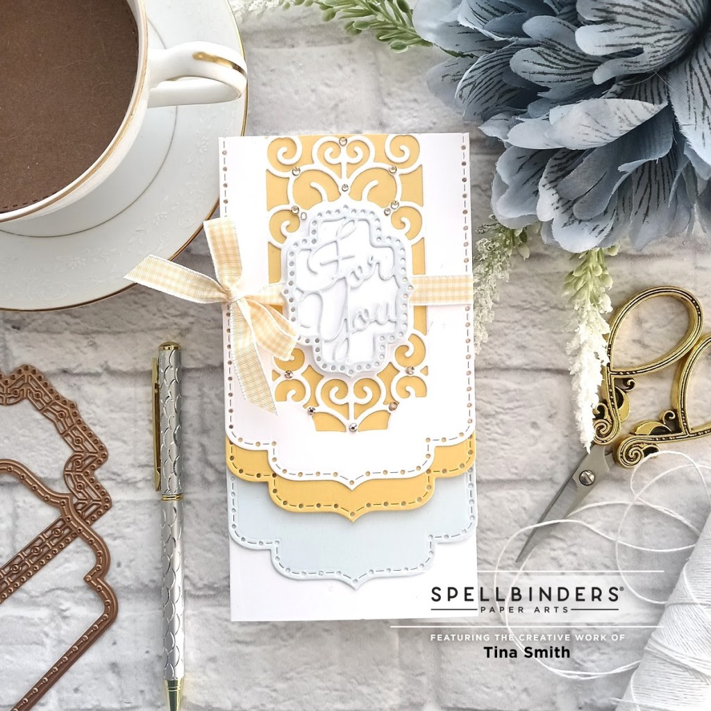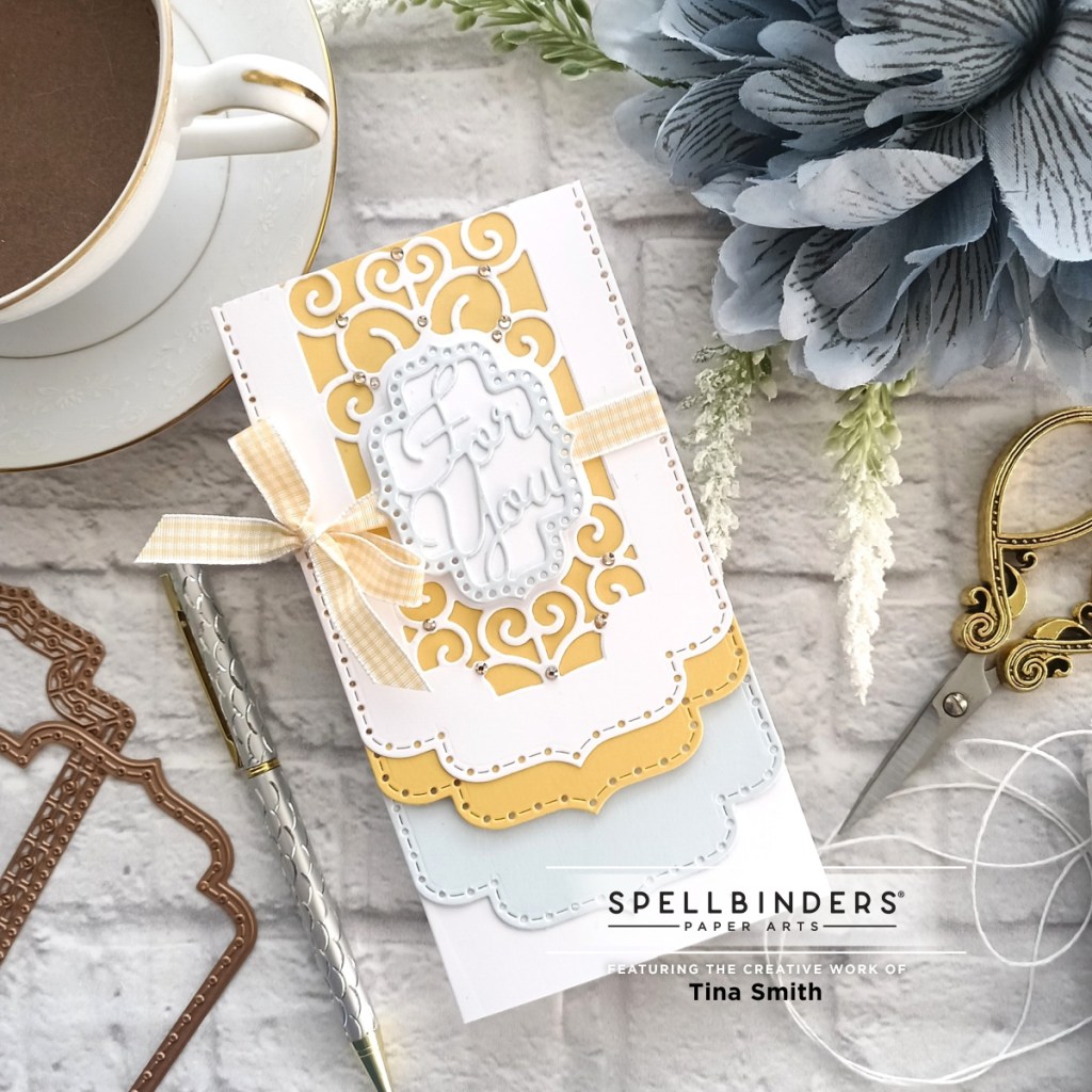 This month the Decorative Mini Slimline Card Creator has 5 Beautiful Cutting Dies. It will create beautiful mini slimline backgrounds with lovely detail. I am in love with the stitched and dotted detail of the largest die. Sharing with you how versatile this set is! I hope you enjoy my card project!