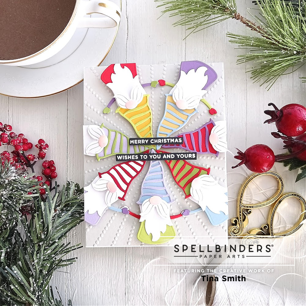 Hello Crafty Friends! Today I am sharing a Christmas card using a stamp set that is part of a Brand New Collection over at the Spellbinders Shop. It is called the Be Merry Collection. Perfect for creating all your Christmas cards early! I am using the oh so fun Holiday Gnomes Stamp set and these guys are the cutest. I love how this turned out and hope you do too:)