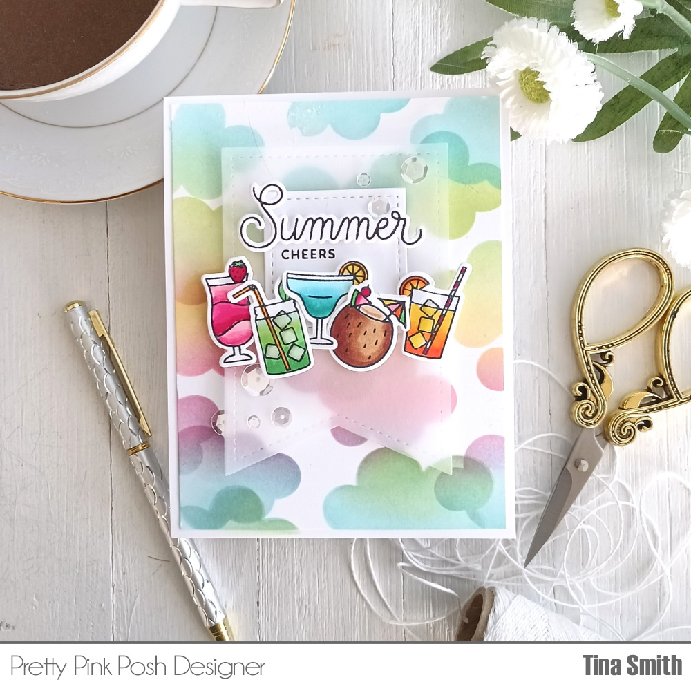 Hello Crafty Friends! I hope your having a wonderful day today! Sharing a crafty project for Pretty Pink Posh with the fun Summer Drinks Stamp Set along with the Summer Drinks Coordinating Die set. I created a rainbow color filled cloudy background with the Layered Clouds Stencils (2 Pack) and love the light and airy – summery outcome.
