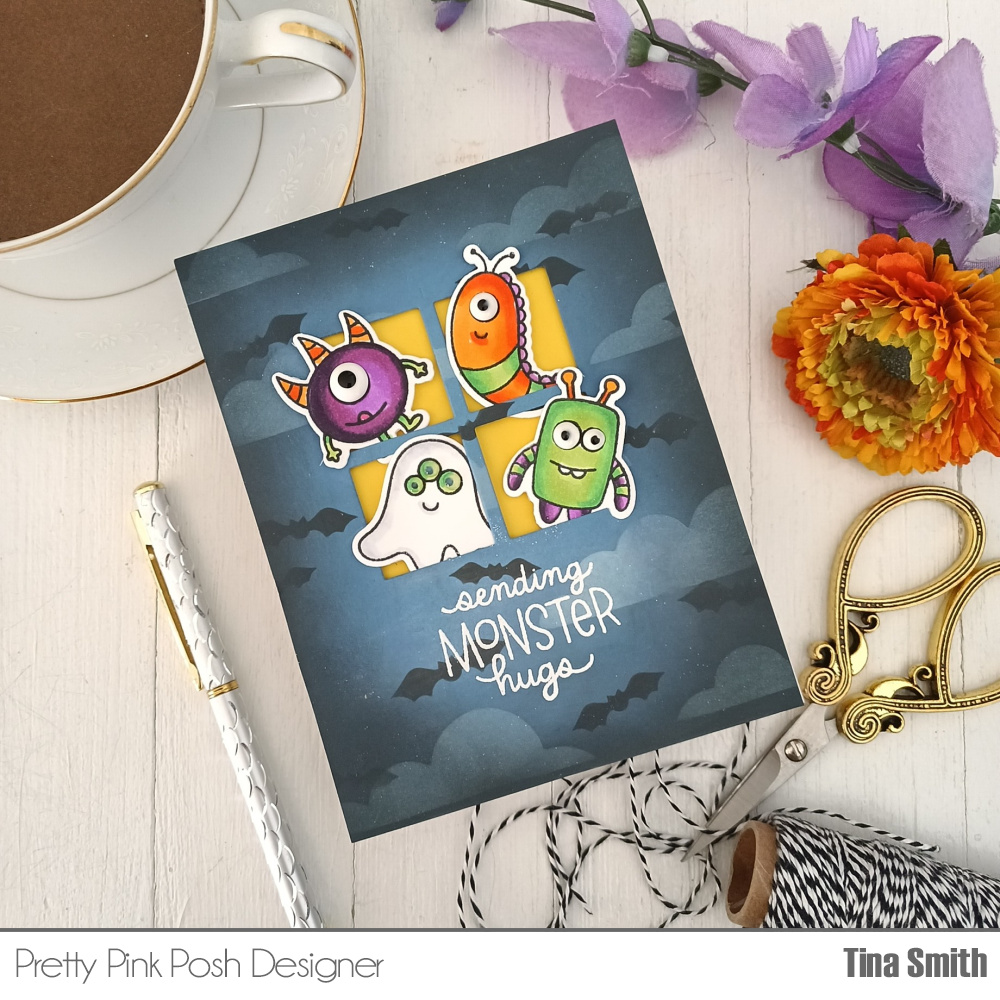 Hello Crafty Friends! I hope your having a lovely day today!  Sharing a fun crafty project for Pretty Pink Posh with the adorable Monster Hugs Stamp Set along with the Monster Hugs Coordinating Die set. I created a Halloween night sky that was super easy with the Spooky Sky Stencils (3 Pack). I am so in love with these monsters!!!