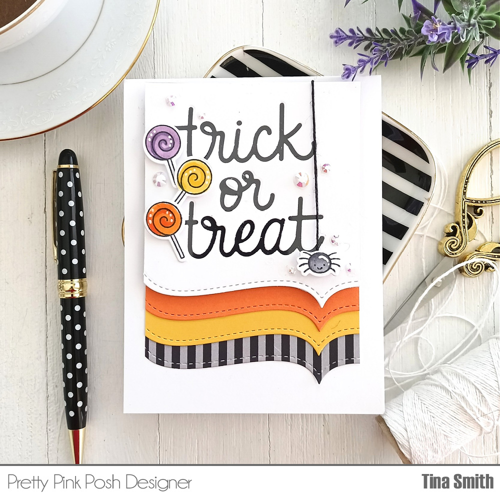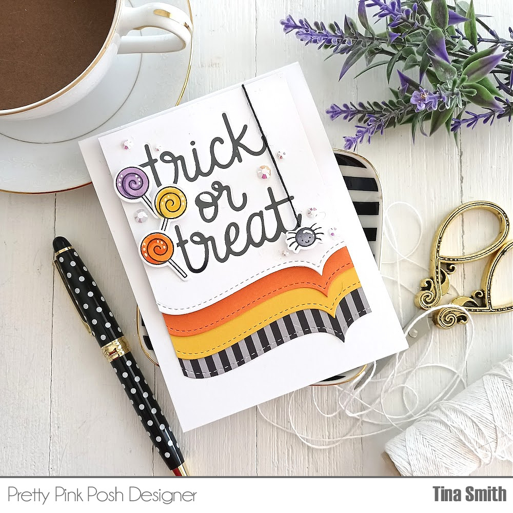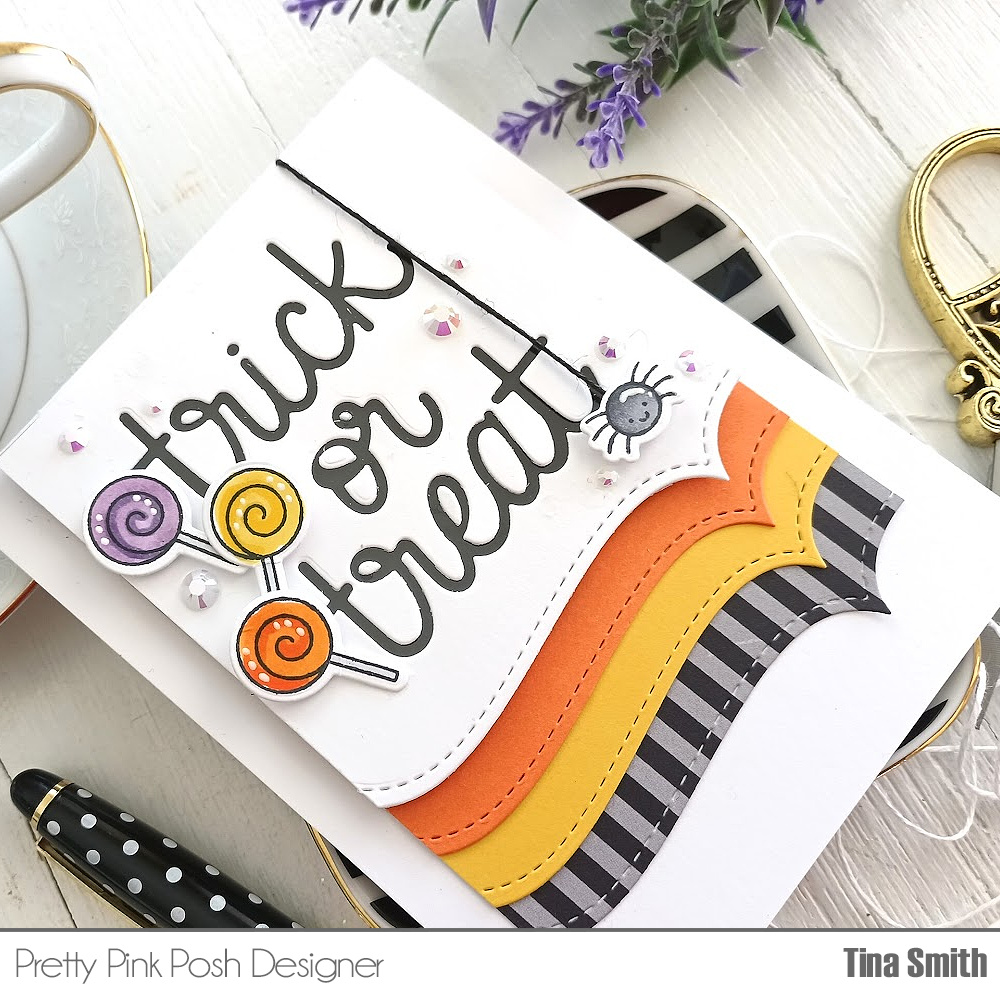 Hello Crafty Friends! I hope your having a lovely day today! Sharing a fun crafty project for Pretty Pink Posh with the adorable Halloween Wreath Stamp Set, the Halloween Wreath Coordinating Die set along with the Trick or Treat Script Die. I created a Halloween color themed background that was super easy using one of the border dies in the Stitched Borders 3 Die Set. I never thought I would say this but I looove that little spider and had to add it!!!!! I hope you enjoy my project!