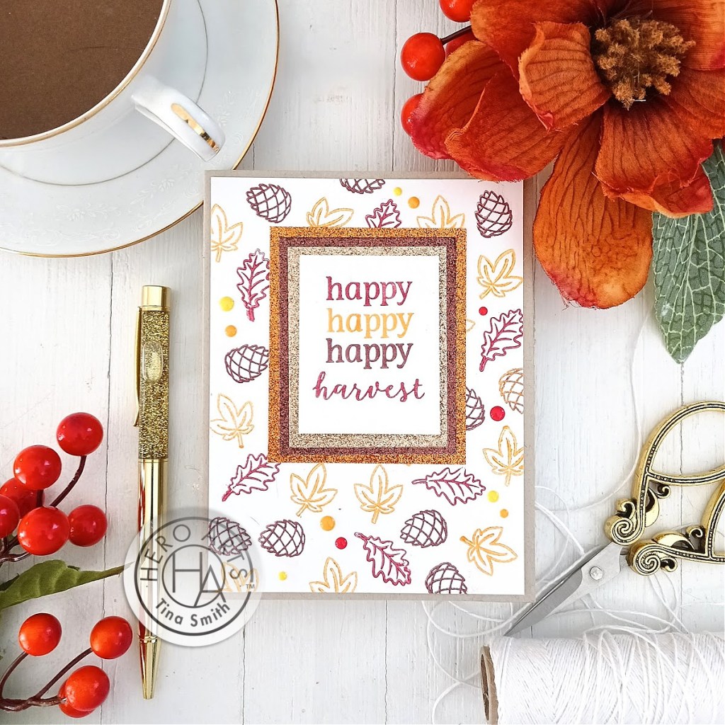 I created 3 cards with a lovely Fall & Autumn theme that are perfect for the coming season!! The sentiments coordinate with the images and are customizable! On the first Thursday of every month I get the pleasure of creating 3 card projects with the MYAH Cardmaking Kits! This month the Cardmaking Kit includes a Clear stamp with Coordinating Frame Cuts, 1 Mini Embossing & Watermark Ink Cube, Embossing Powder, a set of 4 Pigment Mini Hero Hues Inks that are perfect fall colors. Tigers Eye, Citrine, Ruby and Emerald:) There are also 4 – 5.5 x 8.5 Sheets of Hero Hues Premium Cardstock in the color Sand. Also included are 4 – 5.5 x 8.5 Sheets of Hero Arts Woodgrain Embossed Cardstock, 4 – 5.5 x 8.5 Sheets of Hero Arts Glitter Cardstock and for finishing touches they have included some Enamel Dots. WOW!! This kit is fully loaded and has an excellent price point! I love how all my cards turned out and hope you do too!