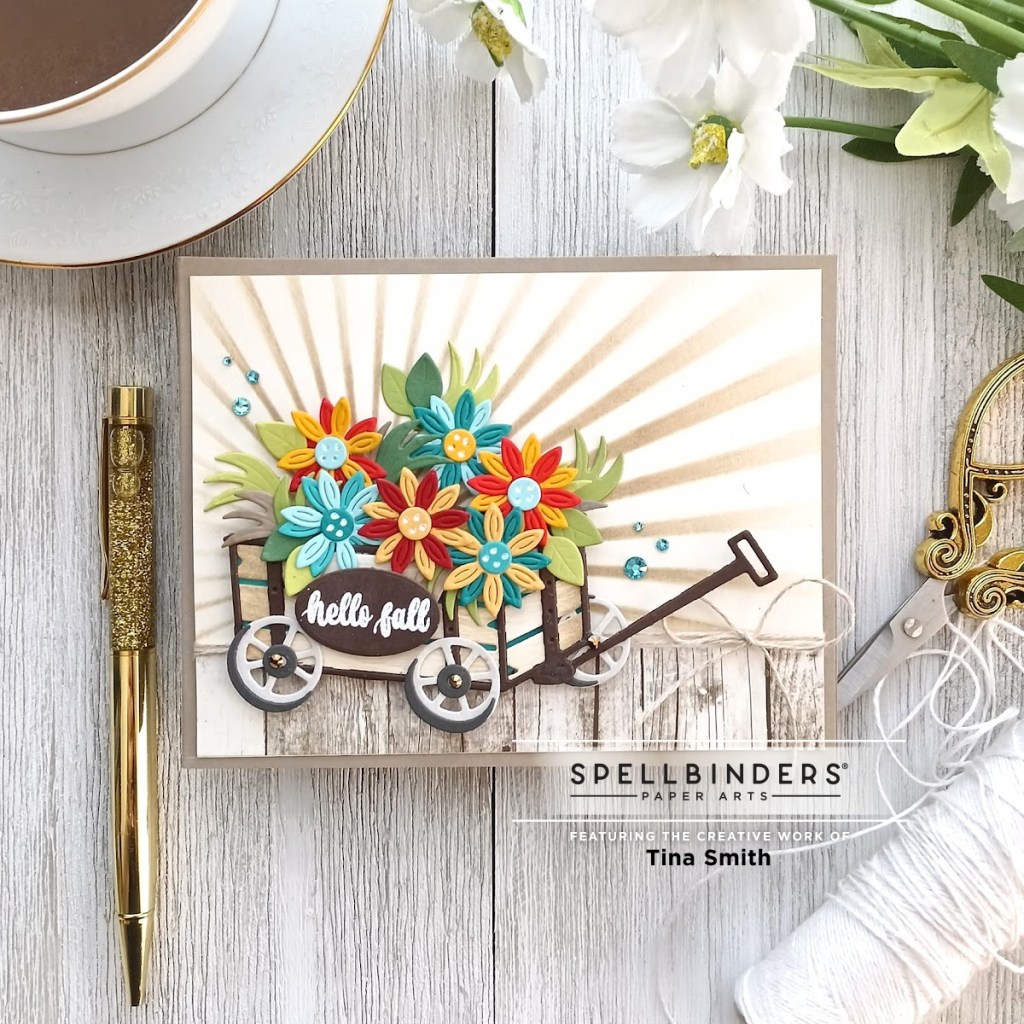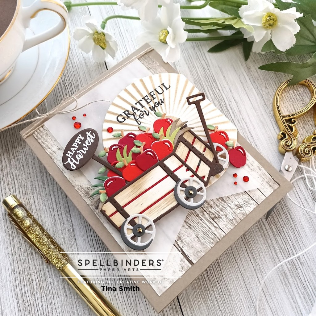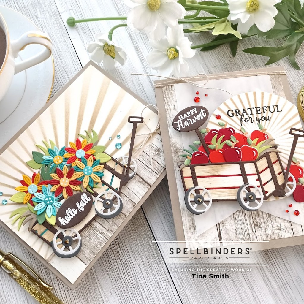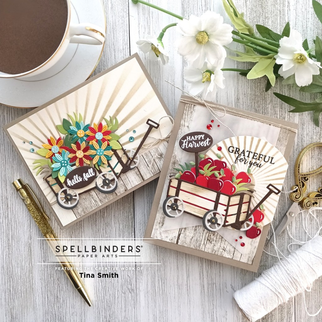 Hi there crafty friends! Tina here from Cards and Coffee Time, I am excited to share with you 2 projects with the New Happy Harvest Collection by Nichol Spohr over at the Spellbinders Shop. I love the Autumn Season, the colors the harvest and the pumpkins of course! This collection is pretty amazing and I had a blast creating with the Wagon Full of Fall Etched Dies from the Happy Harvest Collection by Nichol Spohr and the the Fall Greetings Clear Stamp Set from the Happy Harvest Collection by Nichol Spohr too! I love that you can create so many different wagons and also that you can fill them up with just about any thing!! How fun is that!!