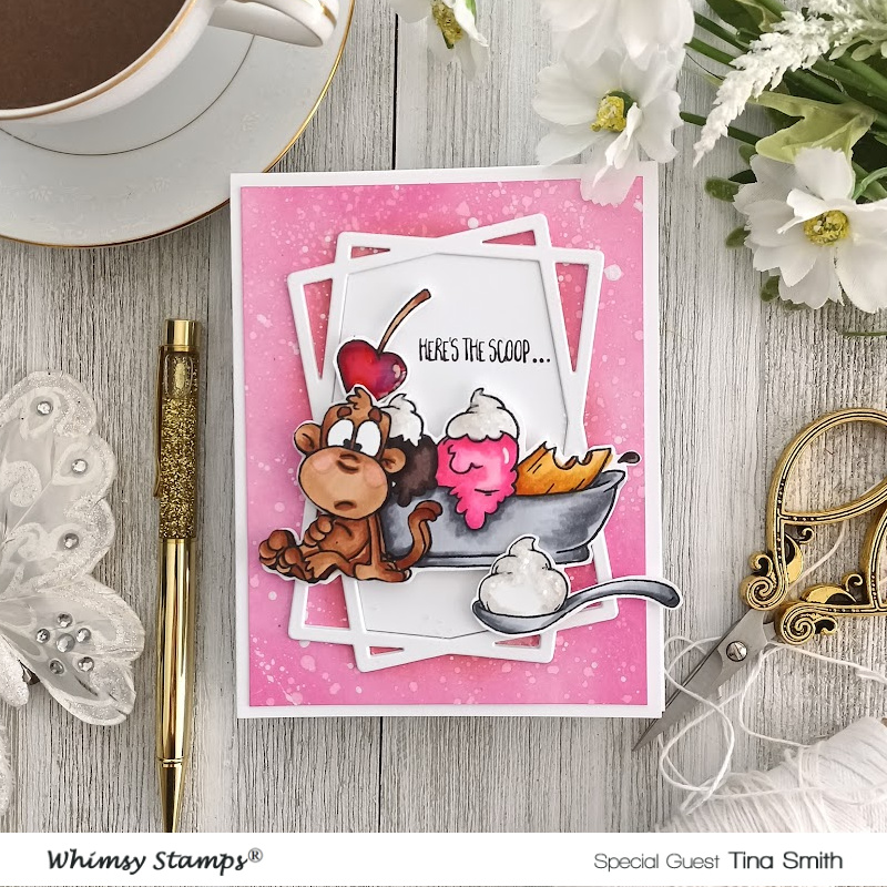 Hello Crafty Friends! I am very excited to be joining Whimsy Stamps this month as a Guest Designer:) It is going to be yummy and I am so happy you can join me! For my final project for the month, I will be creating with oh so delicious Monkey Sundae Stamp set available at the Whimsy Shop. I think everyday is a great day for a sundae!! Add a monkey and it will surely make you smile!! I added the Connected Rectangle Die set in my background for a playful look:) I hope you my project and encourage you to check out Whimsy Stamps!