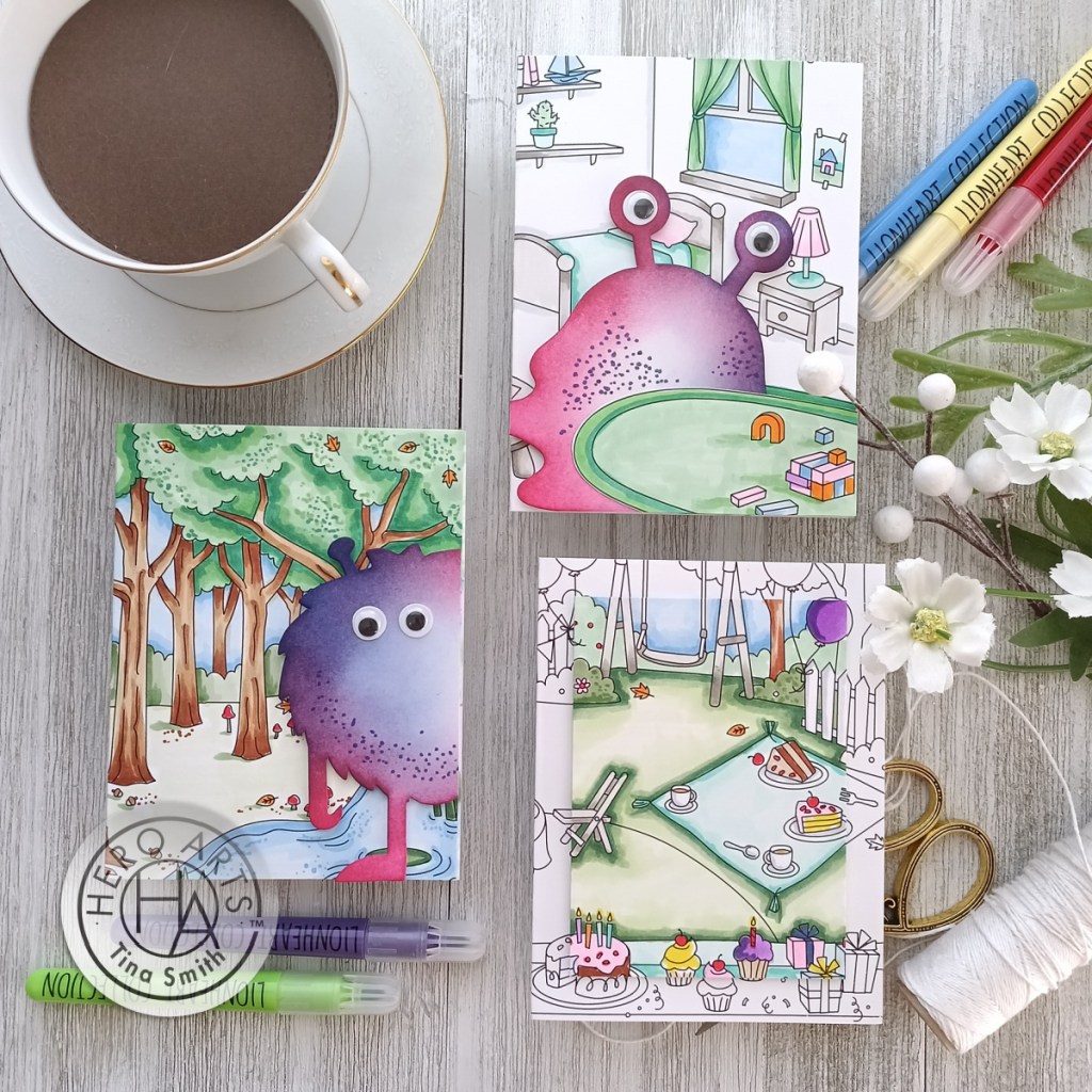 I created 3 cards with a playful monster theme. This kit is perfect for the whole family to join in and create with and the sky is the limit!! Puzzles, Cards and works of….heart!! On the first Thursday of every month I get the pleasure of creating 3 card projects with the MYAH Cardmaking Kits! This month the Cardmaking Kit includes a Monster Ink ‘n’ Stamp Tub (18 stamps + 1 ink), 1 Mini Neon Green Ink Cube, Monster Eyes Woodblock Stamp, a Just For Kids Blue Ink Pad, a Just For Kids Red Ink Pad, 5 Super washable Marker Pens, 10 Paper Monster Die Cuts:) There are also 12 – 6 x 9 Sheets of Monster Scene Stamping Sheets (4 designs, 3 sheets of each) and last but not least Self-Adhesive Googly Eyes. WOW!! This kit is fully loaded and has an excellent price point! I love how playful all my cards turned out and hope you do too!
