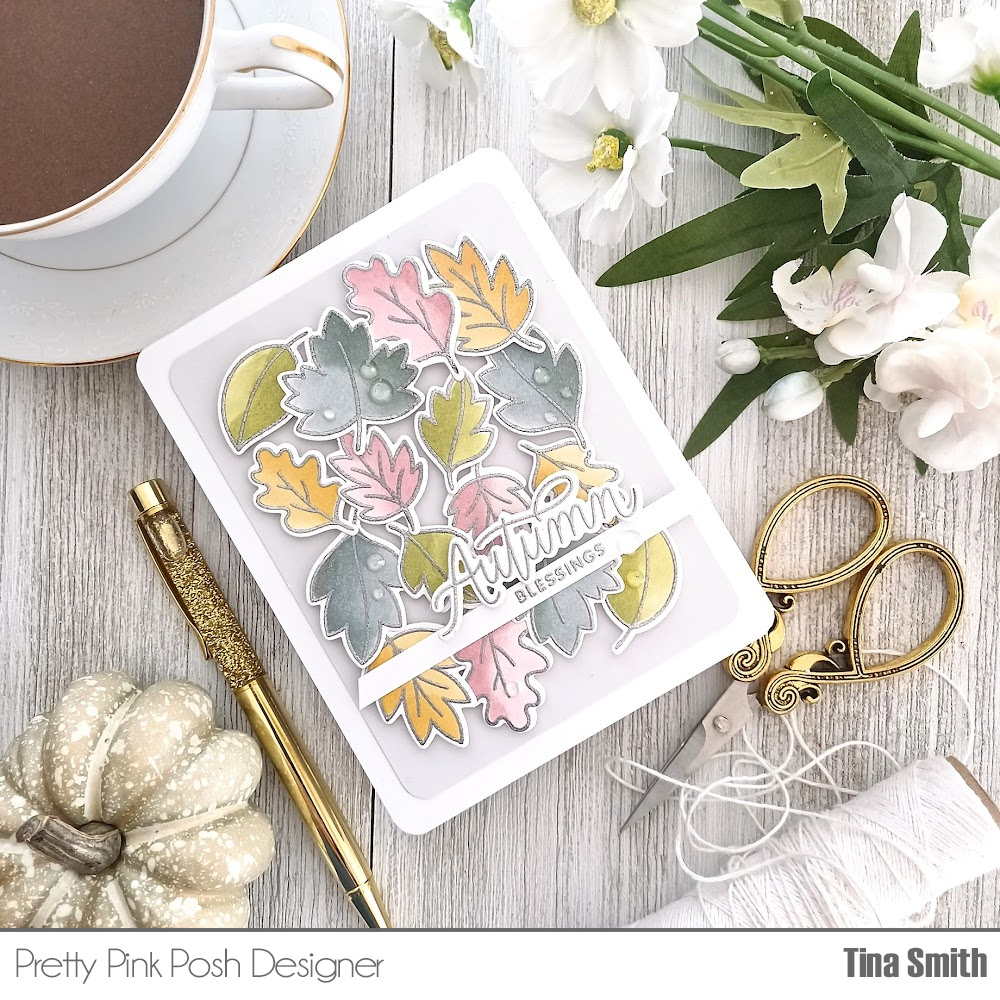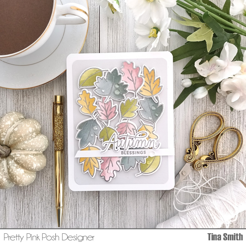 Hello Crafty Friends! I hope your having a delightful day today! Sharing a crafty project for Pretty Pink Posh with the fun Falling Leaves Stamp Set along with the Falling Leaves Coordinating Die set. I absolutely love that PPP has the Falling Leaves Stencil for coloring in these pretty leaves!! Today’s card is pretty simple with all the leaves I created a full background! I love the silver/gray tones, something different!!