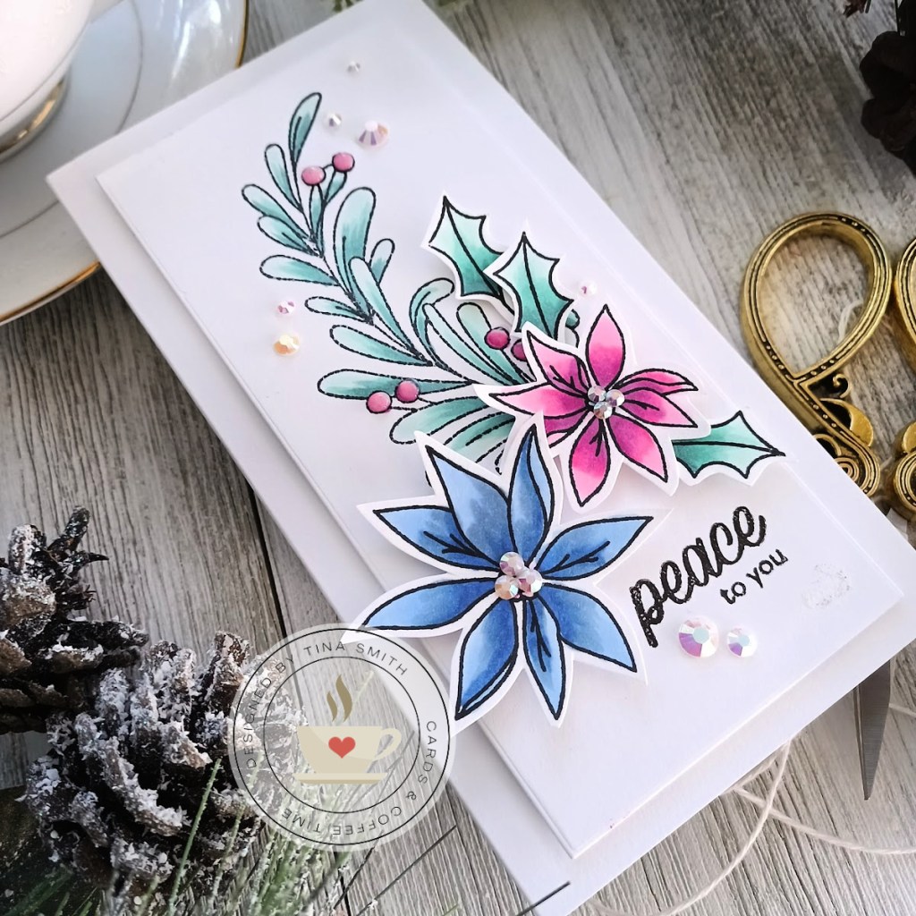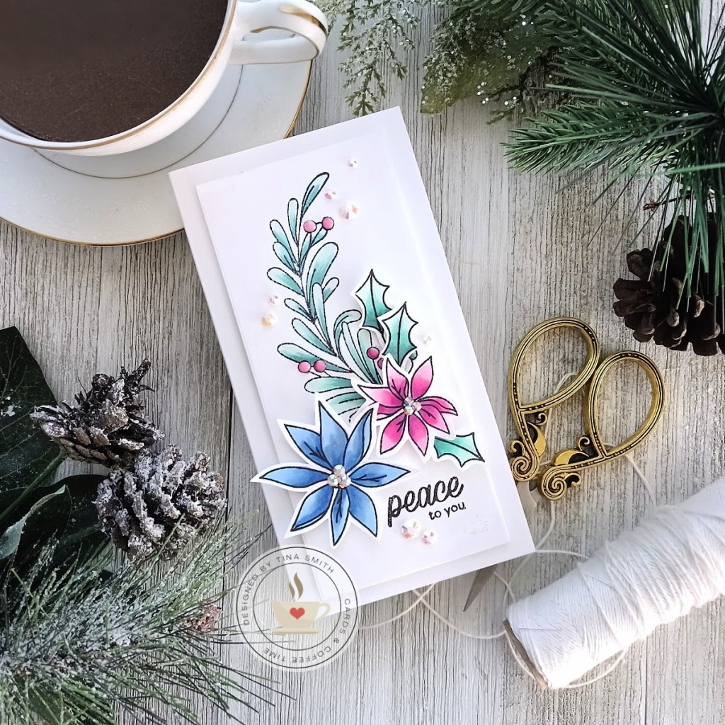 Hello Crafty Friends!  This month the Simon Says Stamp Shop is celebrating and introducing a New Release called “Peace on Earth“, the project I made today is using one of the items in this fun release. I created a mini slimline card with the super pretty Holiday Sprigs Stamp set. Coloring in the images was super easy with copic markers and of course I had to shake it up a bit with non-traditional colors!! I hope you like my project and get a chance to check out the New release over at the Simon Shop!
