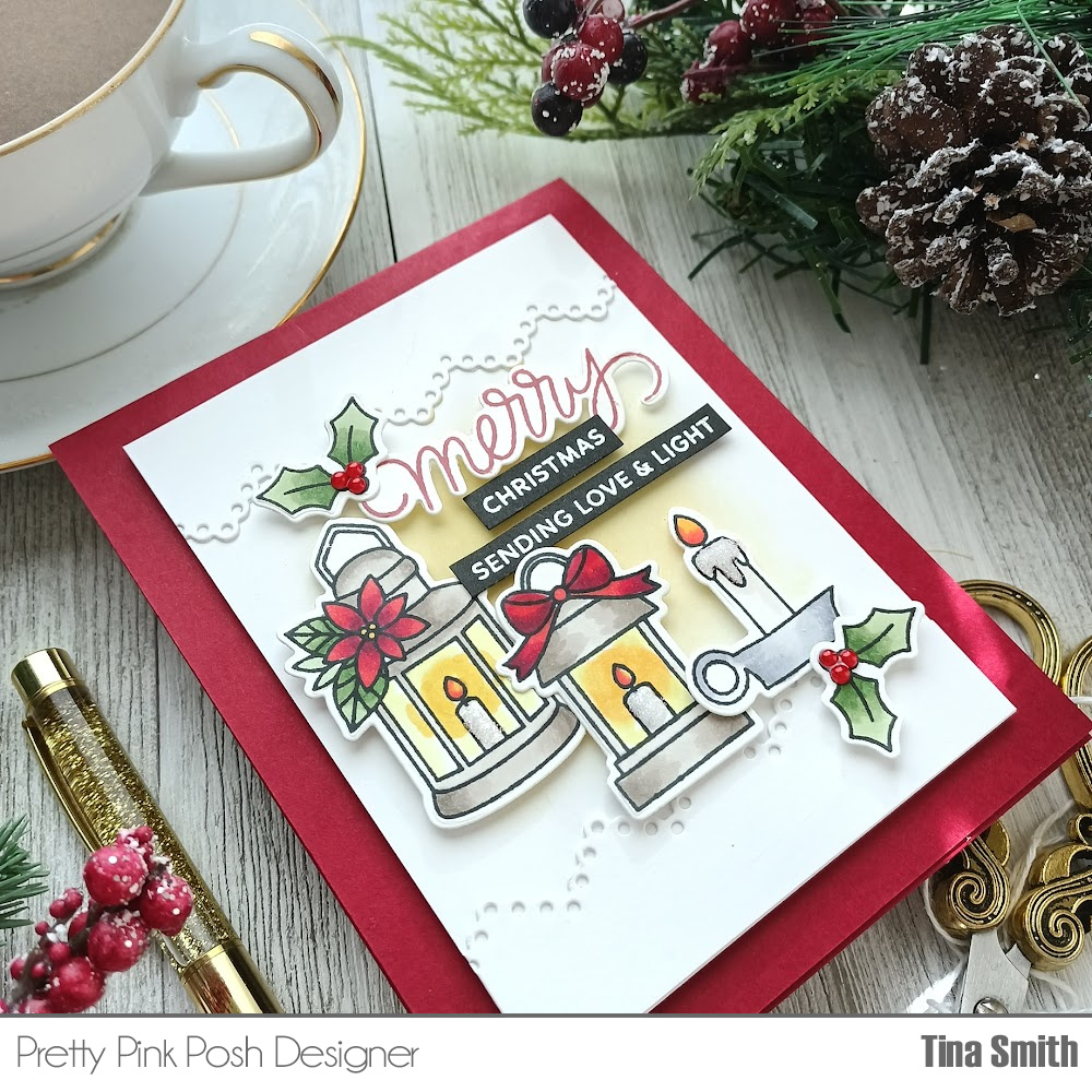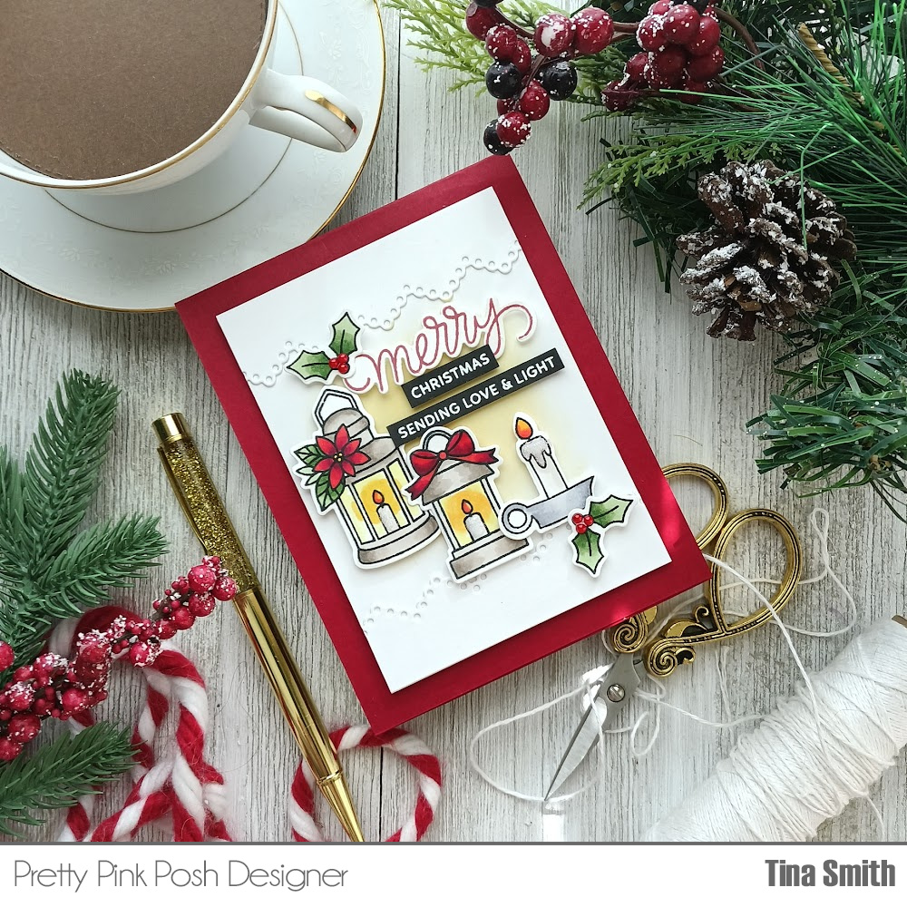 Hello Crafty Friends! I hope your having a wonderful day! I am sharing a crafty project for Pretty Pink Posh with the lovely Christmas Candles Stamp Set and the Coordinating Christmas Candles Die Set. Oh what a pretty glow you can create with these! I created a touch of softness with the Eyelet Borders Die Set along the top & bottom of my panel. I colored in my candle images with Copic markers, nothing fancy just a few traditional Christmas colors. I added some of the new Cherry Red Pearls at the Pretty Pink Posh Shop as the berries on the holly leaf, I love the shine and dimension it gave them, the sentiments go perfectly with the candles too! I hope you like my project!