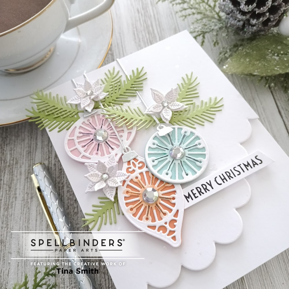 This month the Stitched Curved Border & Ornaments Die Set has 13 stitched lovely cutting dies. Great for all different size card sizes and with all the lovely stitched detail that you can create with them. I didn’t do any stitching today and I love how pretty they are even without it. I did use the pine needles and poinsettias from the Large Die of the Month Club Kit for this Month for decorative details:) Sharing with you how versatile this set is! I hope you enjoy my card project!