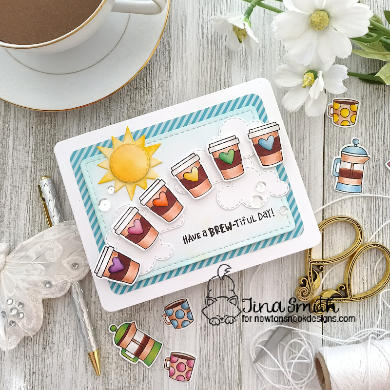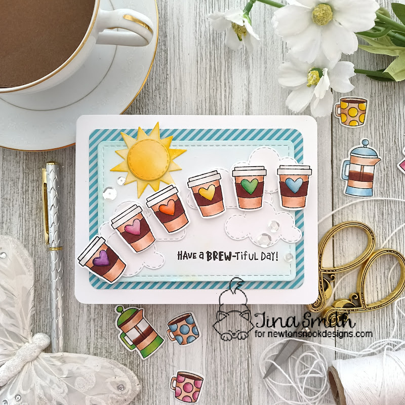I colored my coffee cups from the Time for Coffee Stamp Set with copic markers and die cut it out with the Time for Coffee Die Set. I stamped the “Have a Brew-tiful day” sentiment on a panel die cut with the Frames and Flags Die Set. I created a rainbow of coffee in a cloudy sky with the Sky Scene Builder Die Set. I hope you get a chance to visit the Newton’s Nook Design’s Shop to check out all the amazing release!