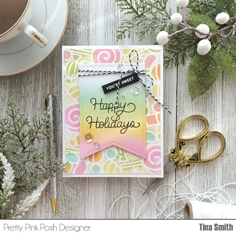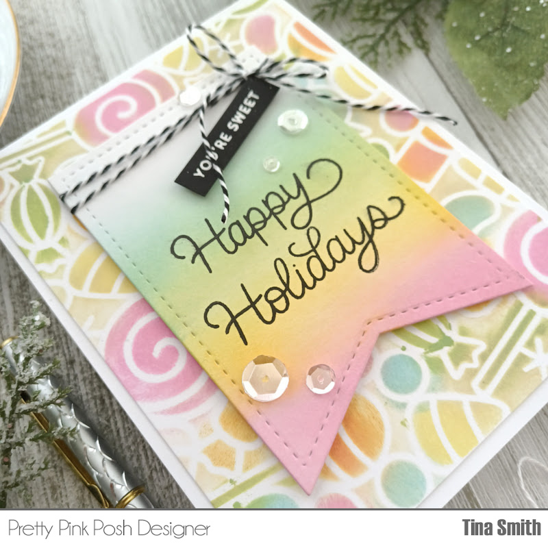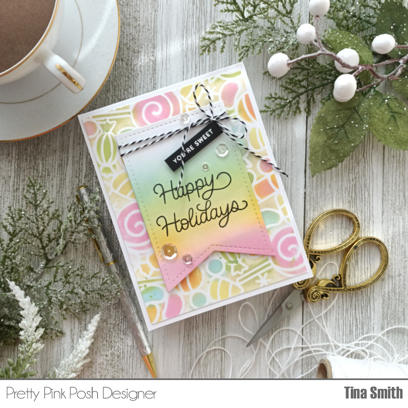 Hello Crafty Friends! I hope your having a wonderful day today! Sharing a crafty Christmas project for Pretty Pink Posh with a stencil from the Halloween release called the Candy Background Stencil I am using the Holiday Scripts Stamp Set along with the Simple Sentiments Stamp set for my sentiments. My background was created using Distress Oxide inks in bright soft colors. I had to to use the the Sparkling Clear Sequins to finish off my project!