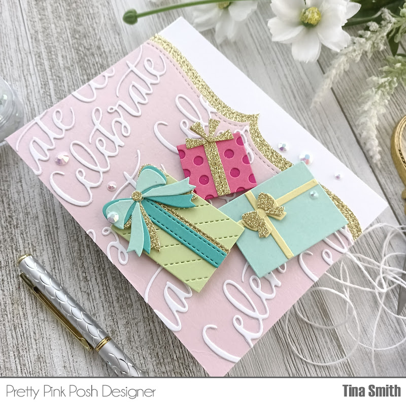 Hello Crafty Friends! I hope your having a wonderful day! I am sharing a project for Pretty Pink Posh with the fun Build a Gift Die Set and the Celebrate Script Die. I am wrapping it up today and created a fun card filled with gifts! I am using my colored cardstock scraps as they work perfectly for die cutting these presents! Creating backgrounds with sentiment dies is so much fun to do too:) hope you like my project!