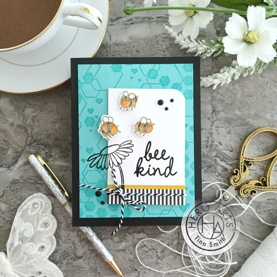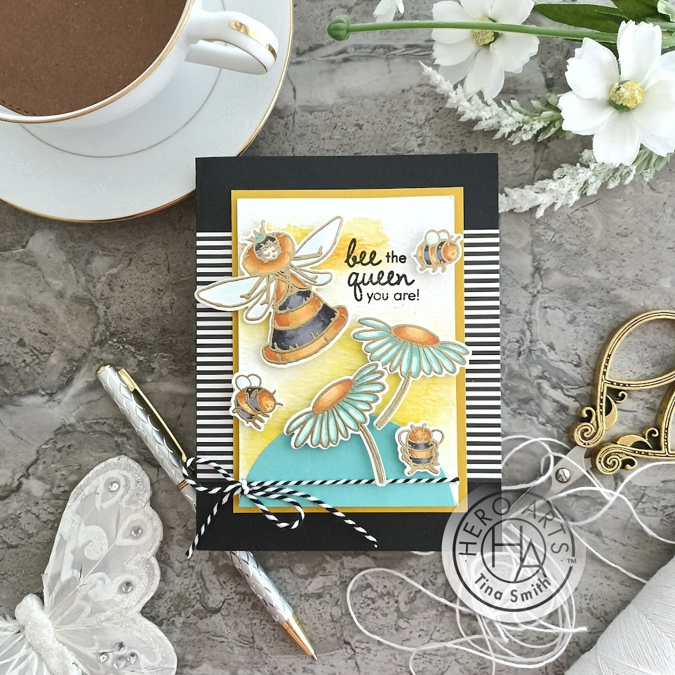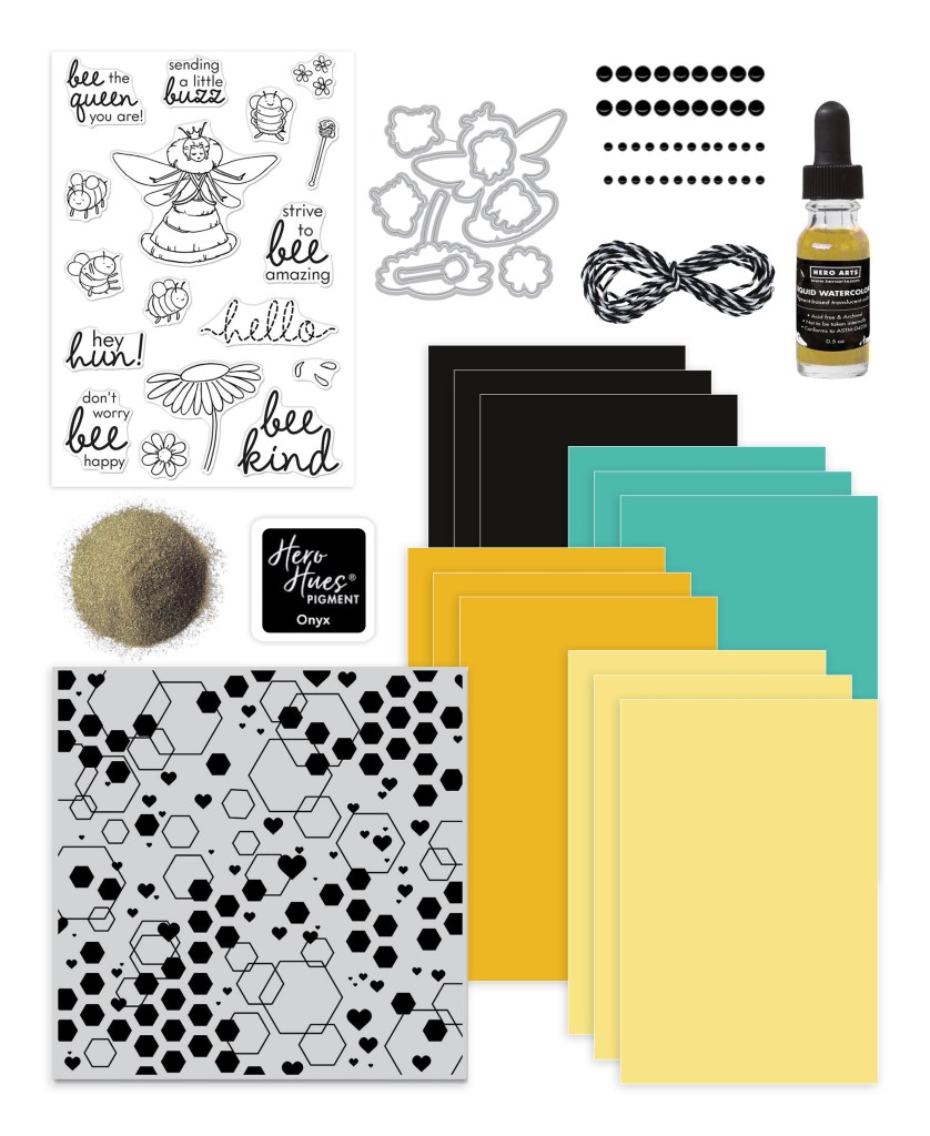 I created a few BEE-utiful cards that will have you buzzing! On the first Thursday of every month I get the pleasure of creating 3 card projects with the MYAH Cardmaking Kits! This month the Cardmaking Kit includes a Bee the Queen Clear stamp with a Bee the Queen Frame Cuts, 1 Jar of Gold Embossing Powder, a Mini Hero Hues Ink in Onyx. There are also 3 – 5.5 x 8.5 Sheets of Premium Cardstock in 4 different colors. Also included is a Abstract Honeycomb Bold Prints Background Cling Stamp, Black Self Adhesive Pearls, Dandelion Liquid Watercolor and last but not least 2 yards of black & white bakers twine. WOW!! This kit is fully loaded and has an excellent price point! I love how all my cards turned out and hope you do too!