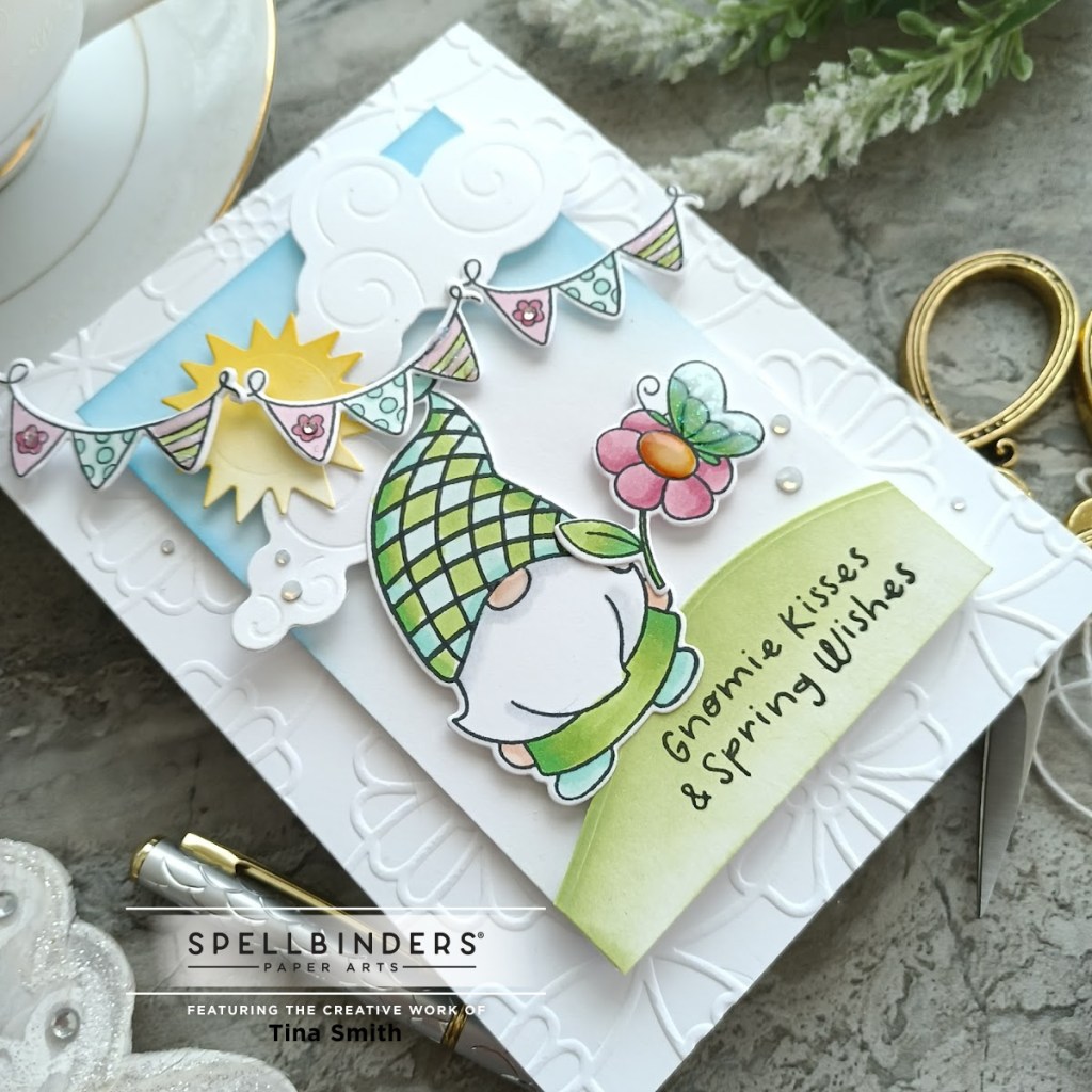 Hello Crafty Friends! Today I am sharing a scene card that is loaded with Spring elements and an adorable gnome! I created it using the Spellbinders Clear Stamp & Die of the Month Club for March 2022. The stamp set is called Spring Gnomes and is a 15 piece clear quality photopolymer 4 x 6 stamp set and the Coordinating Die set will cut out all the images plus 3 sentiments. There is also a Spellbinders Clear Stamp Club Kit without the die set:) I hope you like my project as much as I do!