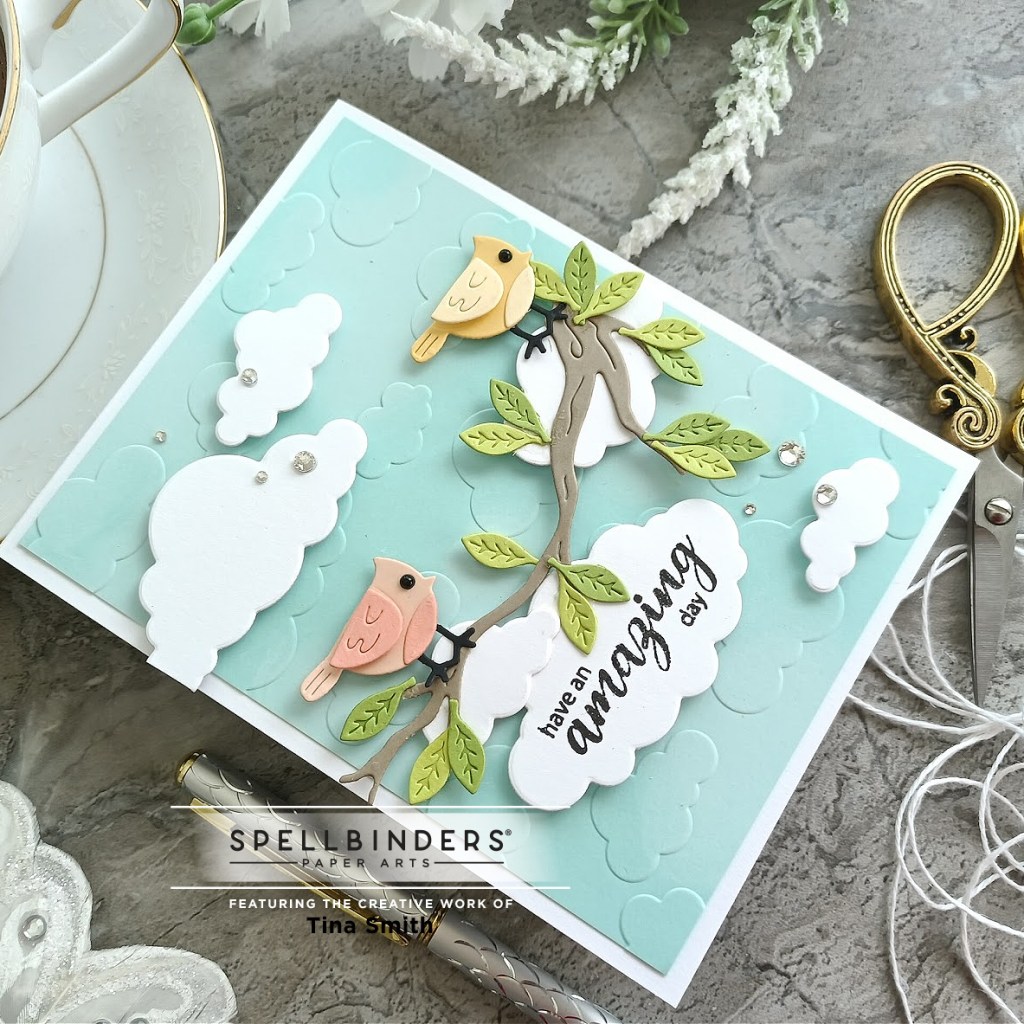 Hello Crafty Friends! Today I am sharing a fun Just Because Spring card using Spellbinders On Cloud Nine Etched Die set over at the Spellbinders Shop. I created a Cloud filled background with them and added even more clouds with the fun Head in the Clouds Embossing Folder. I love how this turned out and hope you do too:)