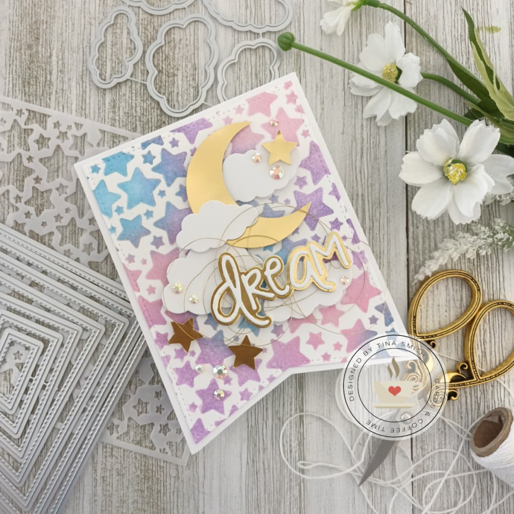 Hello crafty friends! Today’s dreamy card features a few items from Photoplay’s Say It With Stamps Collections:) I combined the Say it With Stamps STARS Stencil along with the Say It With Stamps CLOUDS DIE Set. I also used the PhotoPlay Say It With Stamps NESTED PENNANTS Die Set to create a different shaped card base and love it! Creating a moon is super easy with my circle punches that I have had forever. I hope you like my project!