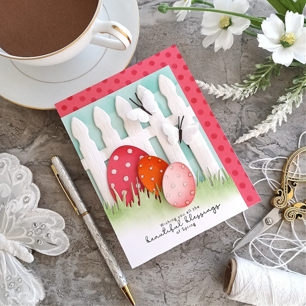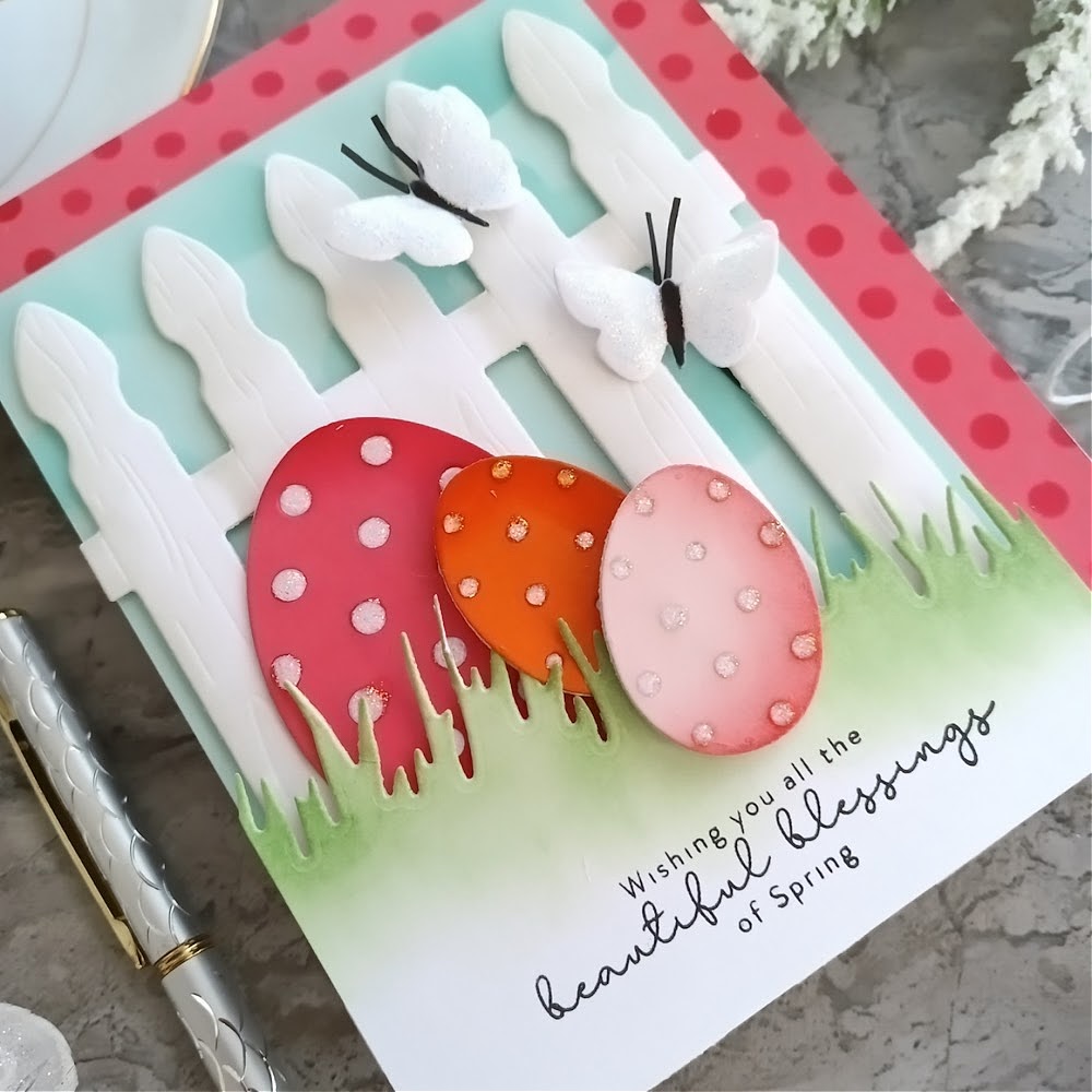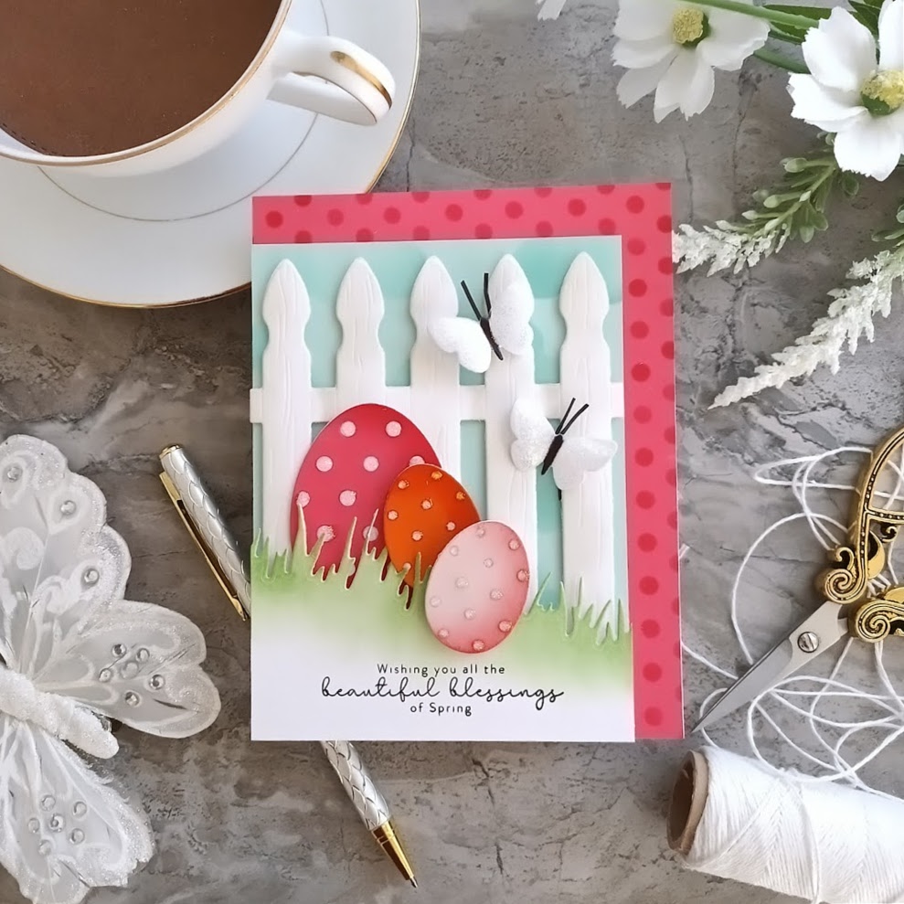 Today’s project features the lovely Elegant Eggs Die set, I die cut out the eggs with some spring colored Perfect Match Cardstock Sampler. I used the Picket Fence Die for my card front along with the Grassy Edge Die, that was a perfect place to stamp a sentiment from the Just Sentiments: Spring Blessings Mini Stamp Set. I also used the Inside Greetings: Spring Blessings Mini Stamp Set for the inside sentiment, I love how this turned out and hope you do too!