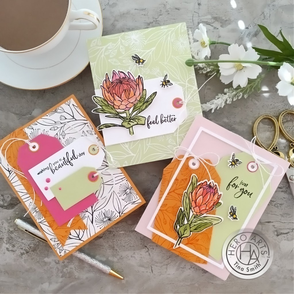 I created a few Protea and Eucalyptus cards that will have you saying hello to Spring! On the first Thursday of every month I get the pleasure of creating 3 card projects with the MYAH Cardmaking Kits! This month the Cardmaking Kit includes a Protea Flowers Stamp with a Protea Flowers Frame Cuts, a Eucalyptus Bold Prints Bold Prints Background Cling Stamp, a 1 Jar of Moss Liquid Watercolor, 4 Mini Hero Hues Reactive Inks. There are also 2 – 5.5 x 8.5 Sheets of Premium Cardstock in 4 different colors in Peony, Kiwi, Papaya and Coral. This kit is fully loaded and has an excellent price point! I love how all my cards turned out and hope you do too!