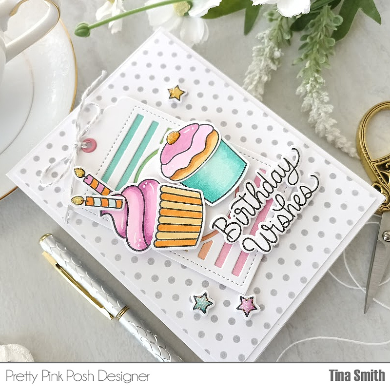 Hello Crafty Friends! I hope your having a wonderful day! I am sharing a project for Pretty Pink Posh with the delicious Build a Cupcake Stamp Set and the Coordinating Build a Cupcake Die Set. I am whipping it up today with some no calorie cupcakes and created a fun birthday card! I am using the super pretty Birthday Circles Die set for a home for those cute cupcakes! Creating backgrounds with polka dots added to the playfulness:) hope you like my project!