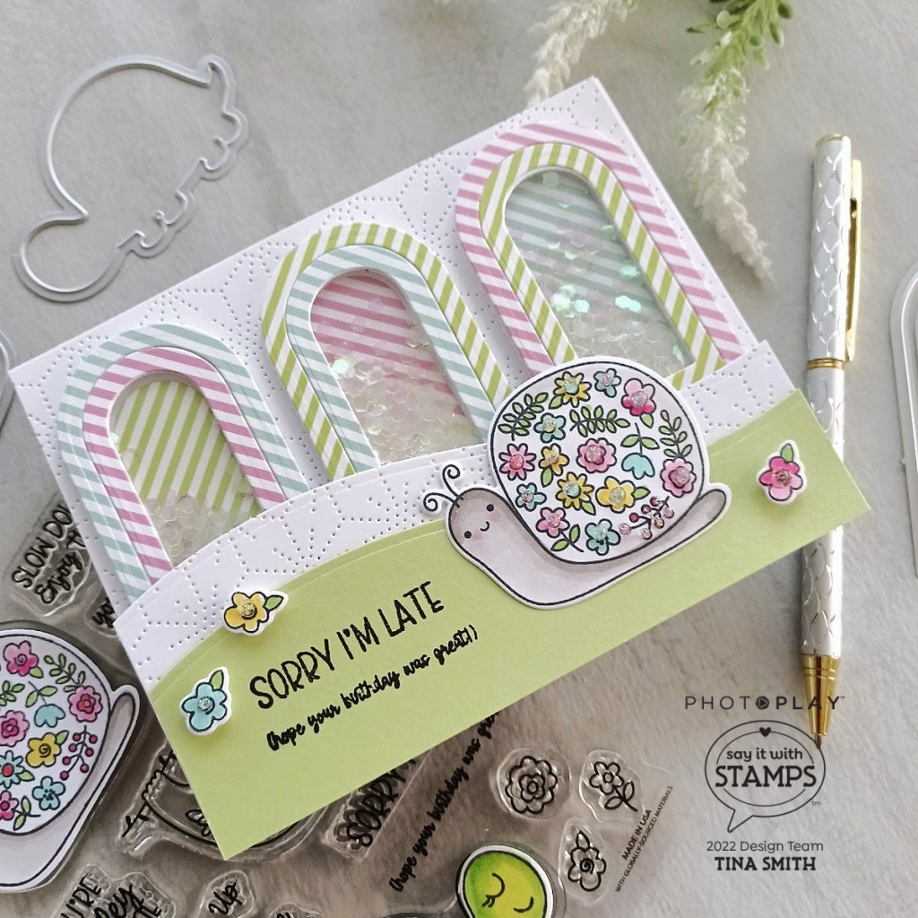 Hello crafty friends! Today’s card features a stamp set perfect for so many occasions! The Slow Down Stamp set along with the Coordinating Slow Down Die Set has cute and adorable slow critters that are sure to make you and the recipient of your handmade card smile. The Say It with Stamps Nested A2 Arches Die set was used for a trio of shakers in the background. I look forward to creating and sharing some more fun projects with the amazing Photoplay Paper Say It with Stamps Collections.