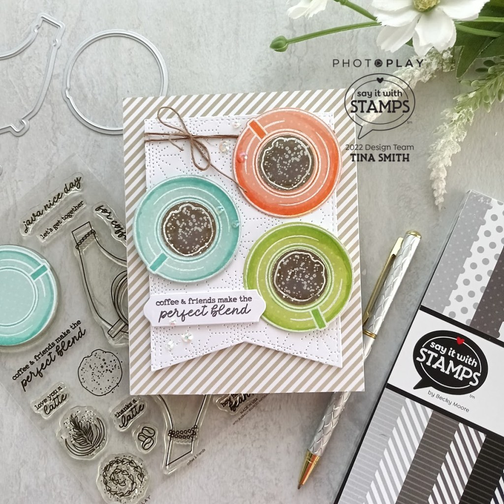 Hello crafty friends! I hope you are having a wonderful day! Today’s card features a stamp set with coffee! The Coffee & Friends Stamp set along with the Coordinating Coffee & Friends Die Set is a perfect set for friendship cards and coffee invitations. The PhotoPlay A2 NESTED PENNANT Die Set detailed with the PhotoPlay A2 STARBURST PIERCED COVERPLATE Die was a nice home for the sky view coffee cups. I haven’t stamped and embossed on patterned paper for a while and thought the coffee cups would look fun with the polka dot patterned papers from the PhotoPlay PASTEL DOTS AND STRIPES 6 x 6 Paper Pad. I look forward to creating and sharing some more fun projects with the amazing Photoplay Paper Say It with Stamps Collections.