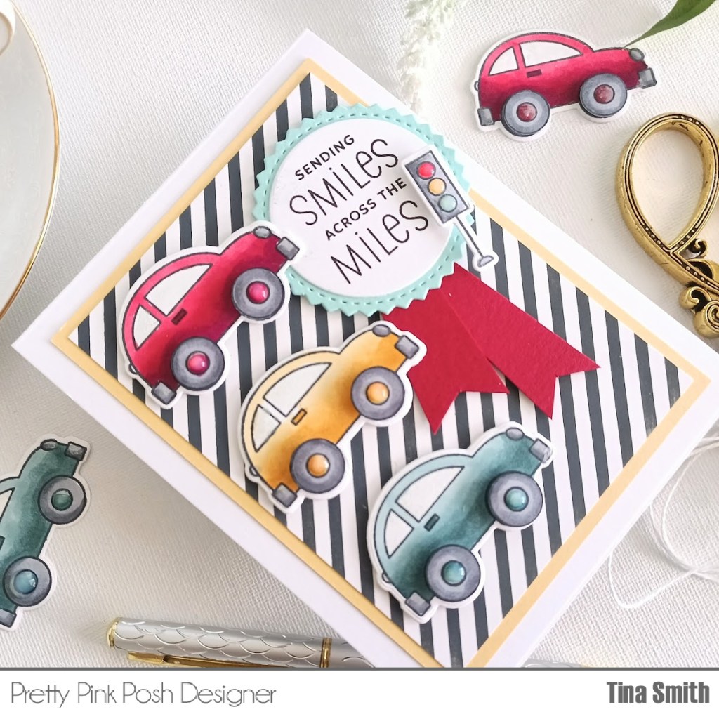 My project features the Across the Miles Stamp Set, & the Across the Miles Coordinating Die both are part of the new release. I created a striped background using the Pinstripe Stencil because..well, I think it goes perfect with these cute cars! Sending Smiles to You!