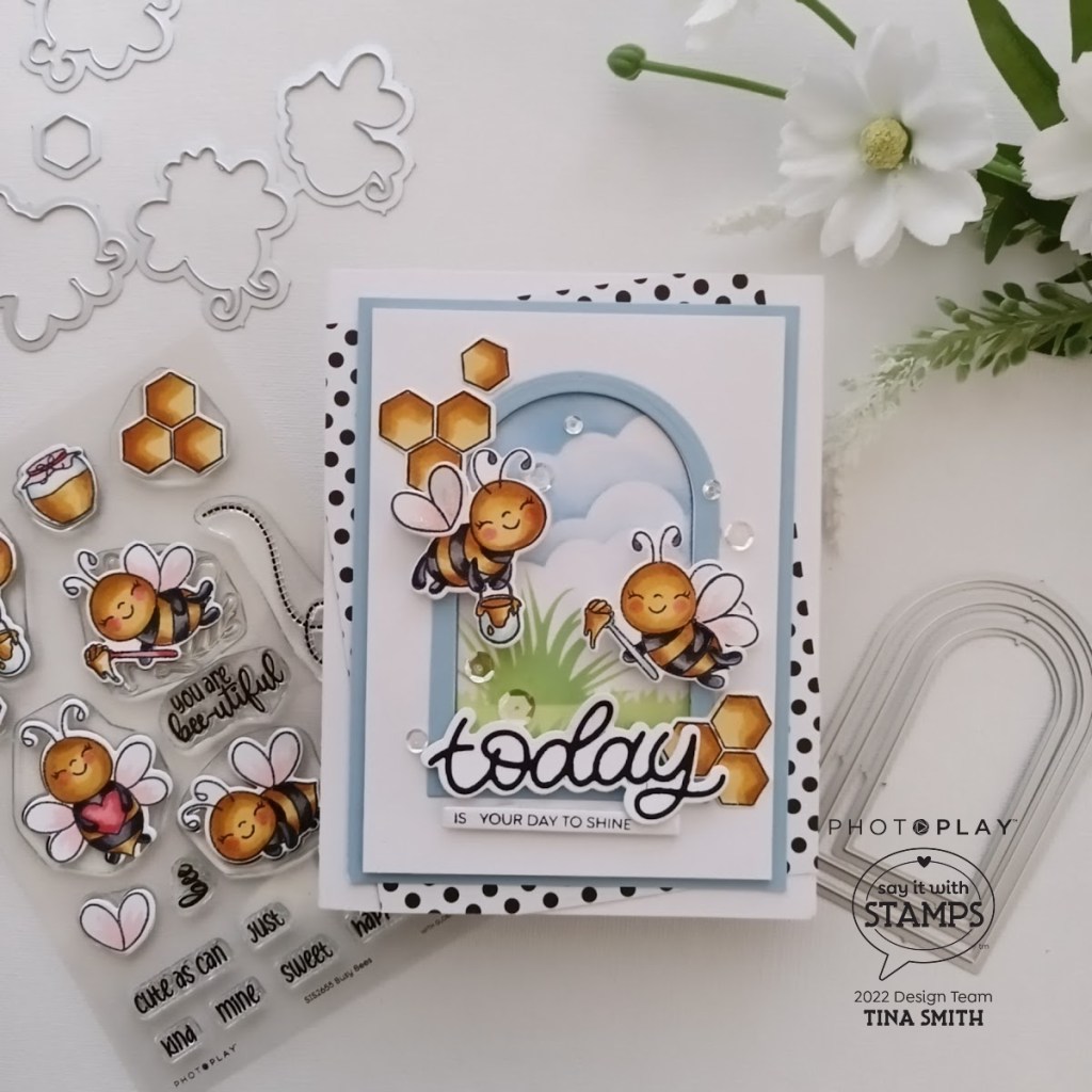 Hello crafty friends! I hope you are having a lovely day! Today’s card features a stamp set that is great for encouragement! The PhotoPlay BUSY BEES Clear Stamps along with the Coordinating PhotoPlay BUSY BEES Die Set is a perfect set for your making buzzworthy cards! Scene building and layers is my thing…I used two 4×9 stencils, the Grass Edger Stencil and the Clouds/Hills Stencil for my window background that was created with the SIS A2 Nested Arches Die Set. I love polka dots and stripes with lady bugs and bumble bees, the dots from the SIS Neutrals 6×6 paper pad was the perfect addition! I look forward to creating and sharing some more fun projects with the amazing Photoplay Paper Say It with Stamps Collections.
