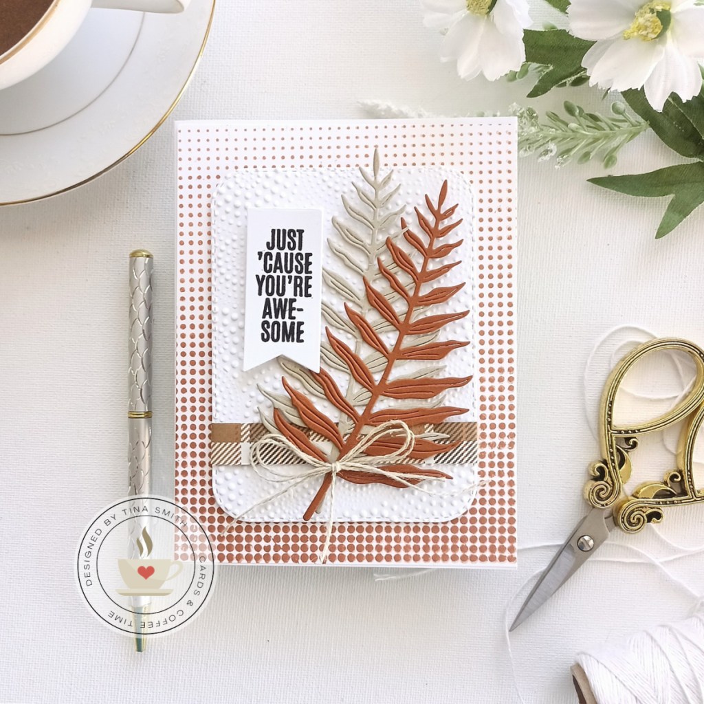 Hello and Happy Tuesday Crafty Friends! Today I am sharing a card featuring a new embossing folder and die from Simon Says Stamp, the Simon Says Stamp DIBBLE DOT Embossing Folder and the Simon Says Stamp SWORD FERN Wafer Die It is part of the Simon Says Stamp Dream Big Release🙂 I created my background using the Simon Says Cling Stamp HALFTONE BACKGROUND and patterned paper from the PhotoPlay FALL PLAID 6 x 6 Paper Pad. The sentiment was created with an older stamp set from the Simon Shop, the JUST BECAUSE WORD MIX 2 stamp and the Coordinating WORD MIX 2 Wafer Die Set. I hope you like it!!