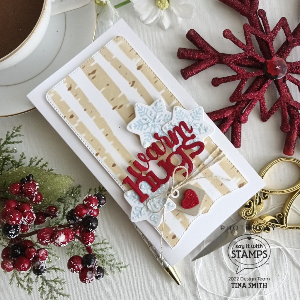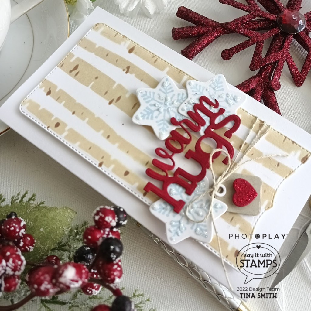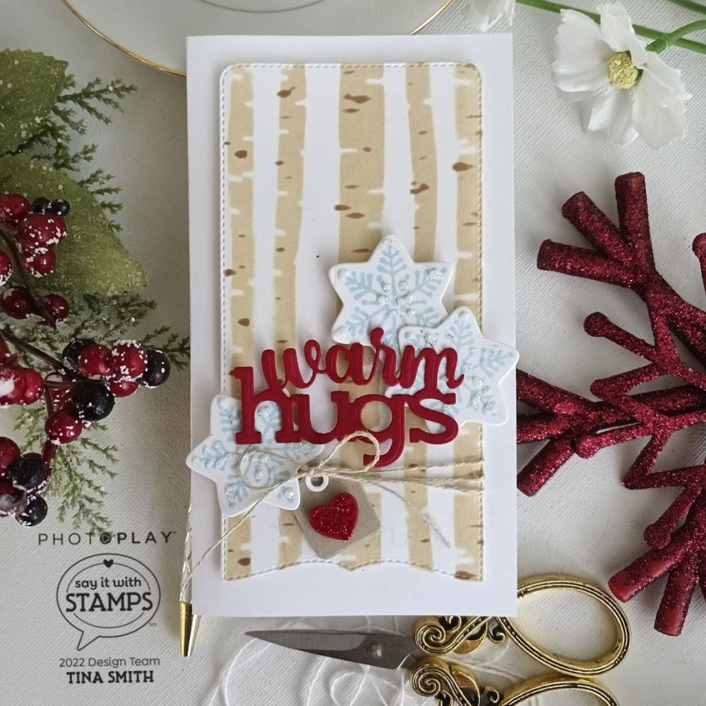 Hello crafty friends! I hope you are having a great day! Today we are creating a fun background with a NEW Say It With Stamps Say It With Stamps BIRCH TREES Stencil Set along with the Say It with Stamps AUTUMN WORD TRIO Die Set. I ink blended the birch trees with my Distress Oxide inks, using Antique Linen and Vintage Photo. I created my background panel using the new Say It with Stamps MINI SLIM BRACKET AND CHARMS Die Set. The mini charms are a perfect way to add extra color. I wanted some snowflakes, I die cut 3 out with the snowflake in the Christmas Cookies Stamp set and Coordinating Die to go with it. I look forward to creating and sharing some more fun projects with the amazing Photoplay Paper Say It with Stamps Collections.