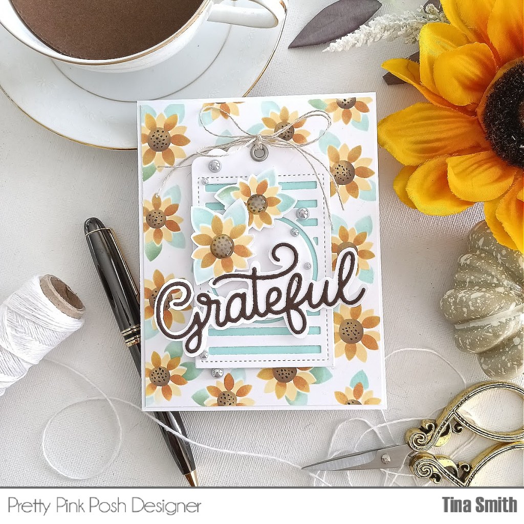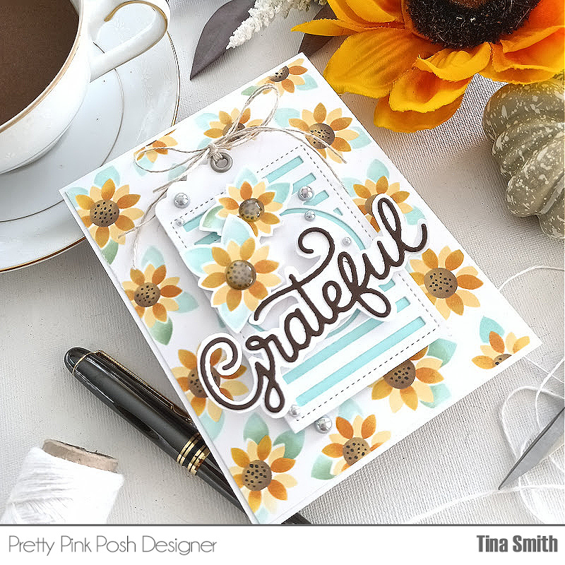 My projects features the Grateful Script Die Set and the Layered Sunflowers Stencil Set (4 Piece) both are part of the new release. The tag die is an oldie but goodie and is called the Birthday Circles Die Set.