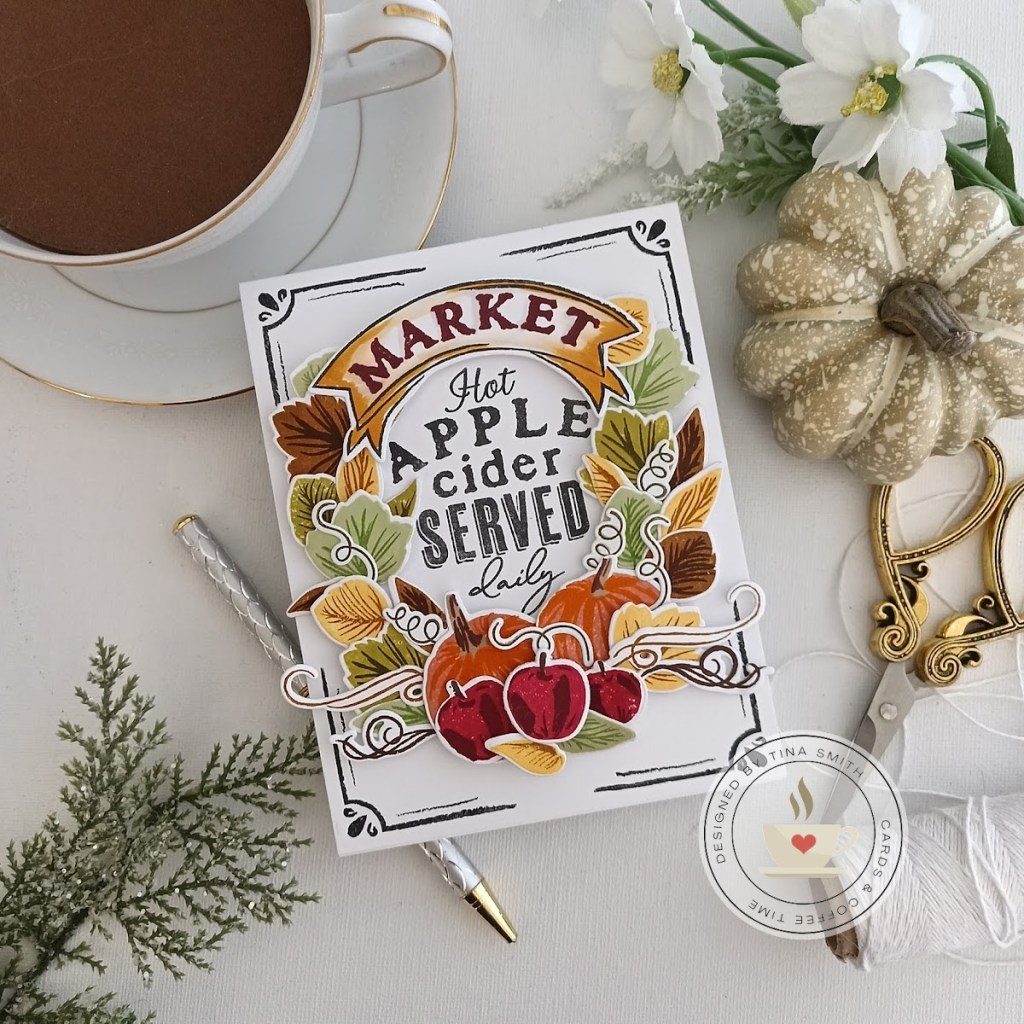 Hello crafty friends! I hope you are having a great day! I love farmers markets during the Autumn Season! The Fall Farmers Market Stamp Set is perfect for this time of year as it creates a fantastic customizable farmers market themed cards. I love that you can mix and match all the elements of this set. Available at the Papertrey Ink Shop. I love creating frames, the leaves in the stamp set are so pretty I decided to use them as a frame in traditional fall colors. The layers of them created beautiful texture for them. I only had to use inks and the Coordinating Fall Farmers Market Die Set for this card, can you believe it! I love a stamp set that does all the work for you:)