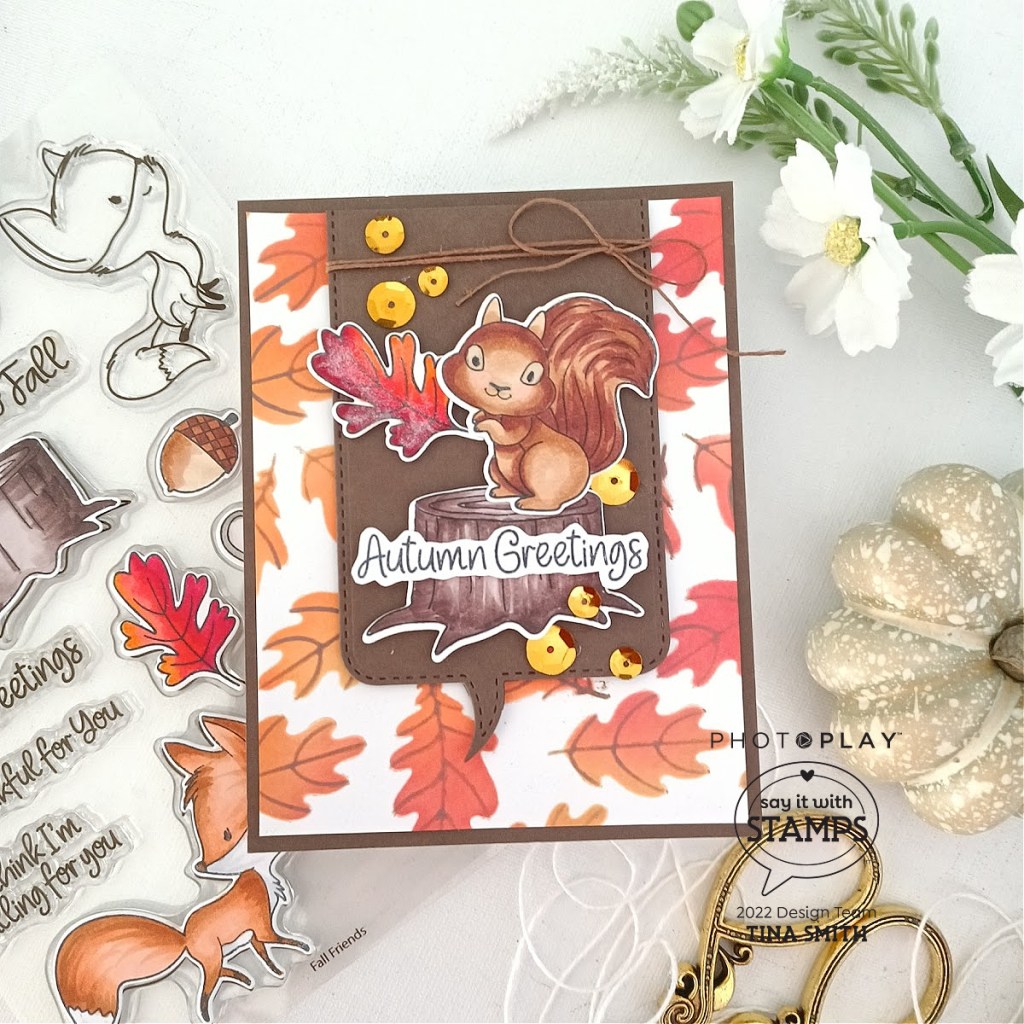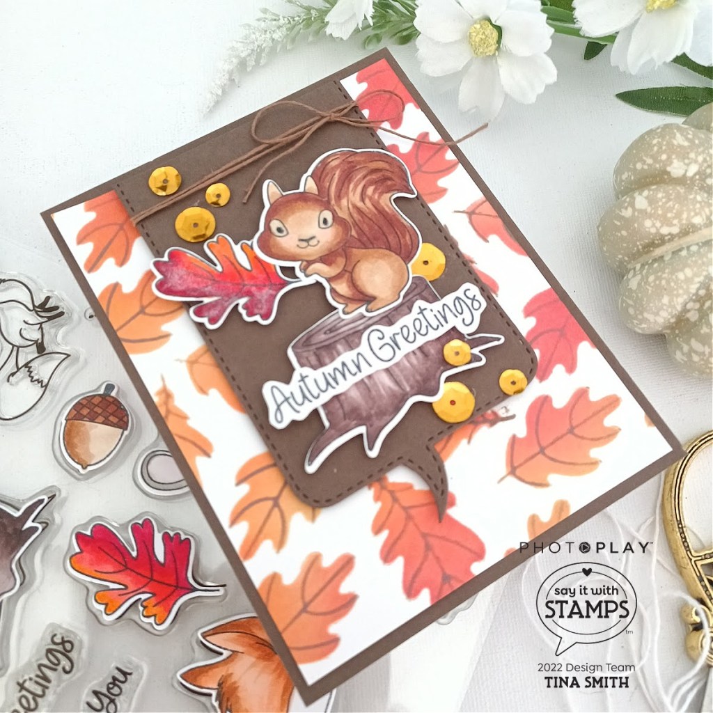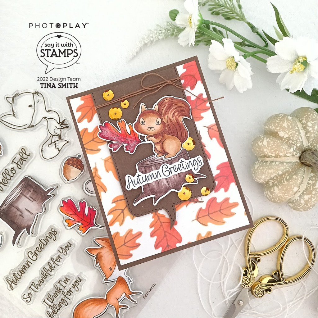 Hello crafty friends! I hope you are having a great day! Today we are creating a scene with the PhotoPlay HELLO FALL Clear Stamps, the Coordinating PhotoPlay HELLO FALL Die Set. I ink blended my background scene with the PhotoPlay LEAVES ARE FALLING Stencil Set and die cut it out a home for my adorable squirrel with the #6 Bracket/Speech Bubble Die Set. These cute critters are so fun and it again was difficult to decide which one I wanted to use on my project! I chose the adorable squirrel and created a scene with him sitting on the tree trunk. I love scene building and love how this turned out. I look forward to creating and sharing some more fun projects with the amazing Photoplay Paper Say It with Stamps Collections.