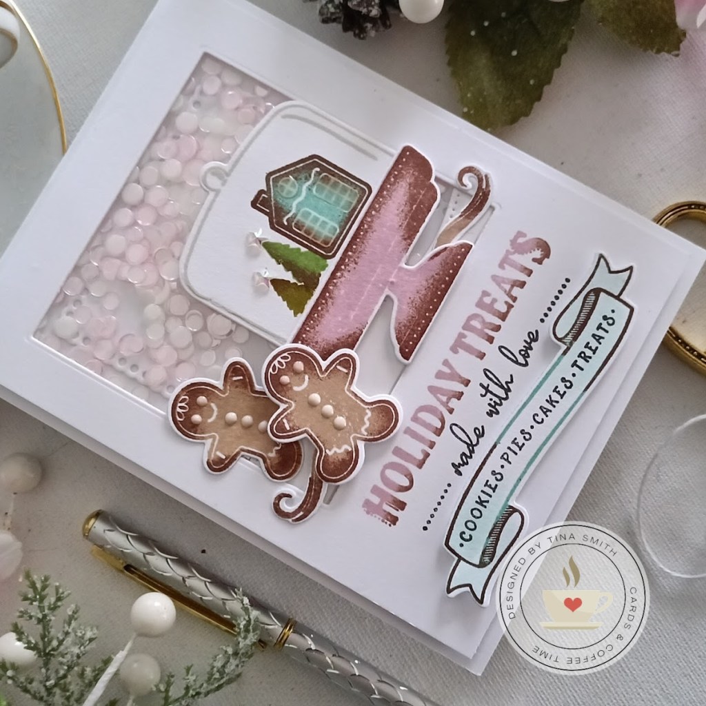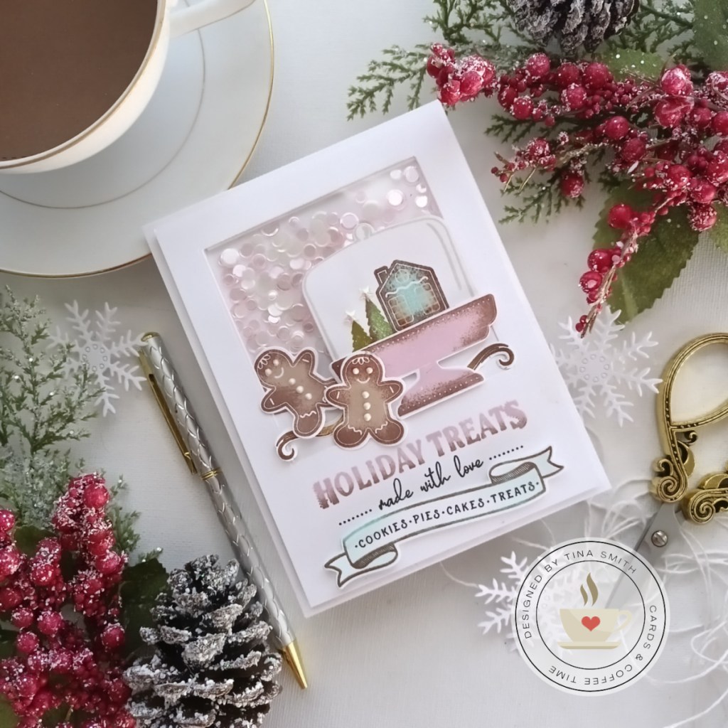 Hello crafty friends! Tina here, with a fun & sweet Christmas card with the Gingerbread Bakery Stamp Set along with the Coordinating Gingerbread Bakery Die Set from the Papertrey Ink new release! I think pinks and browns are the perfect bakery colors and fun Holiday colors too! I used Lovely Lady and Fresh Snow Moonshine Sequins to fill my shaker, also adding a bit of dainty with one of the Love to Layer: Square Dies. I created browned edges with Dark Chocolate ink in all my images including the Holiday Treats sentiment and banner. The color I used for my gingerbread is Classic Kraft. The Cookies in the dome I used Hawaiian Shores, Leaf Green and Ripe Avocado. Baked goodies for Christmas are my favorite gift to give and this set is a perfect stamp to create cards and tags for them:) I hope you like my project!