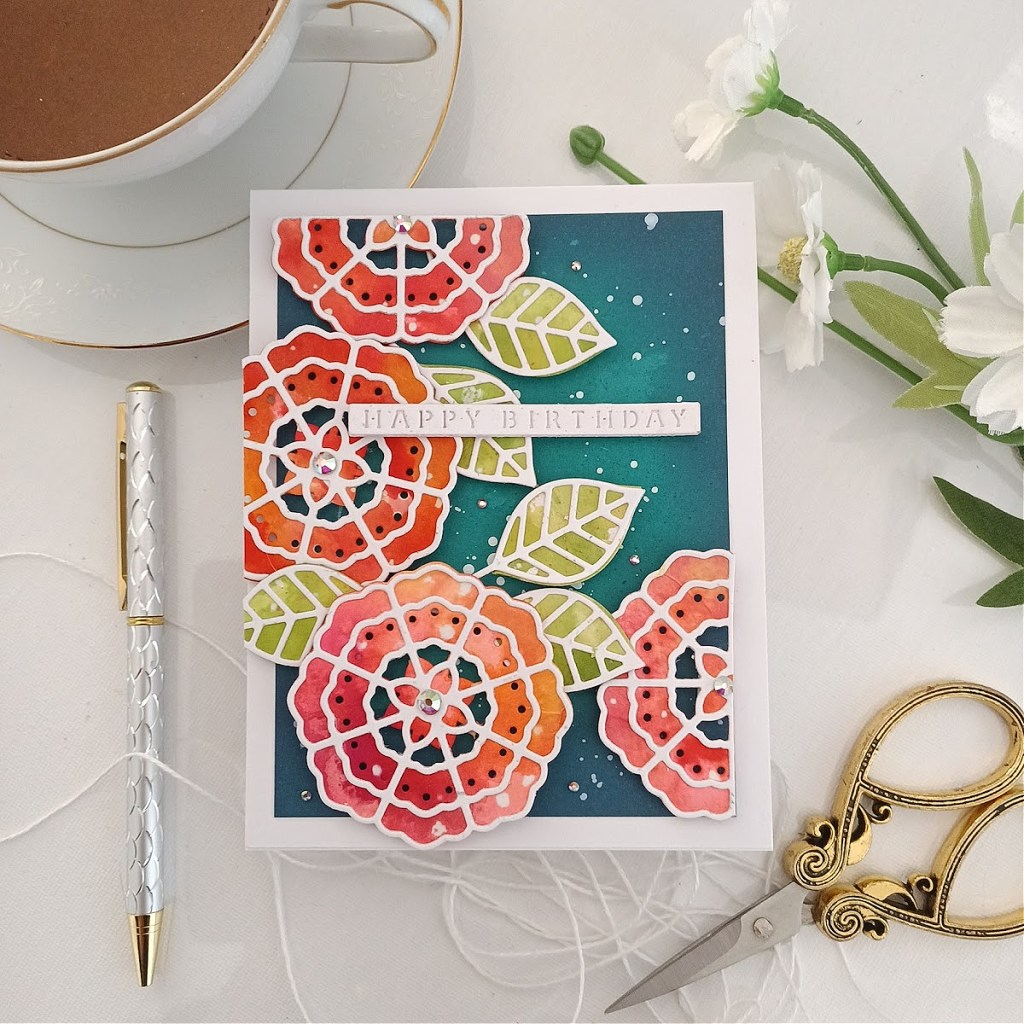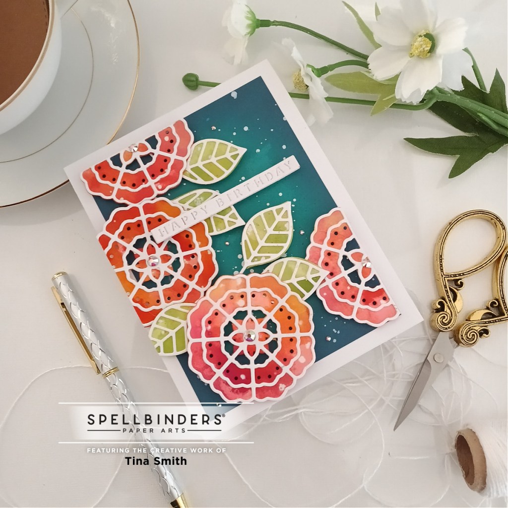 Hello Crafty Friends, I hope you are having a great day! Today I am die cut dipping a card with using the Spellbinders Large Die of the Month Club Kit for NOVEMBER 2022. This month there are 8 cutting dies included in the Stylized Floral Kaleidoscope Slimline the dies this month create a slimline background with a triple layer of unique floral style centers. I always like to do a different take on the die set so I just used the flowers and the leaves today. I hope you enjoy my project!