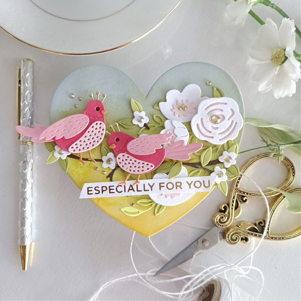 Hello Crafty Friends, I hope you are having a great day! Today I am creating a card using the Spellbinders Large Die of the Month Club Kit for DECEMBER 2022. This month there are 13 cutting dies included in the Blooming Heart Die Set, the dies this month create a large heart that can be used as a shaped card with beautiful florals that can be layered or used on their own. I always like to do a different take on the die set so I decided to also use the bird and branch dies from the Spellbinders Card Kit of the Month for this month too. I hope you enjoy my project!