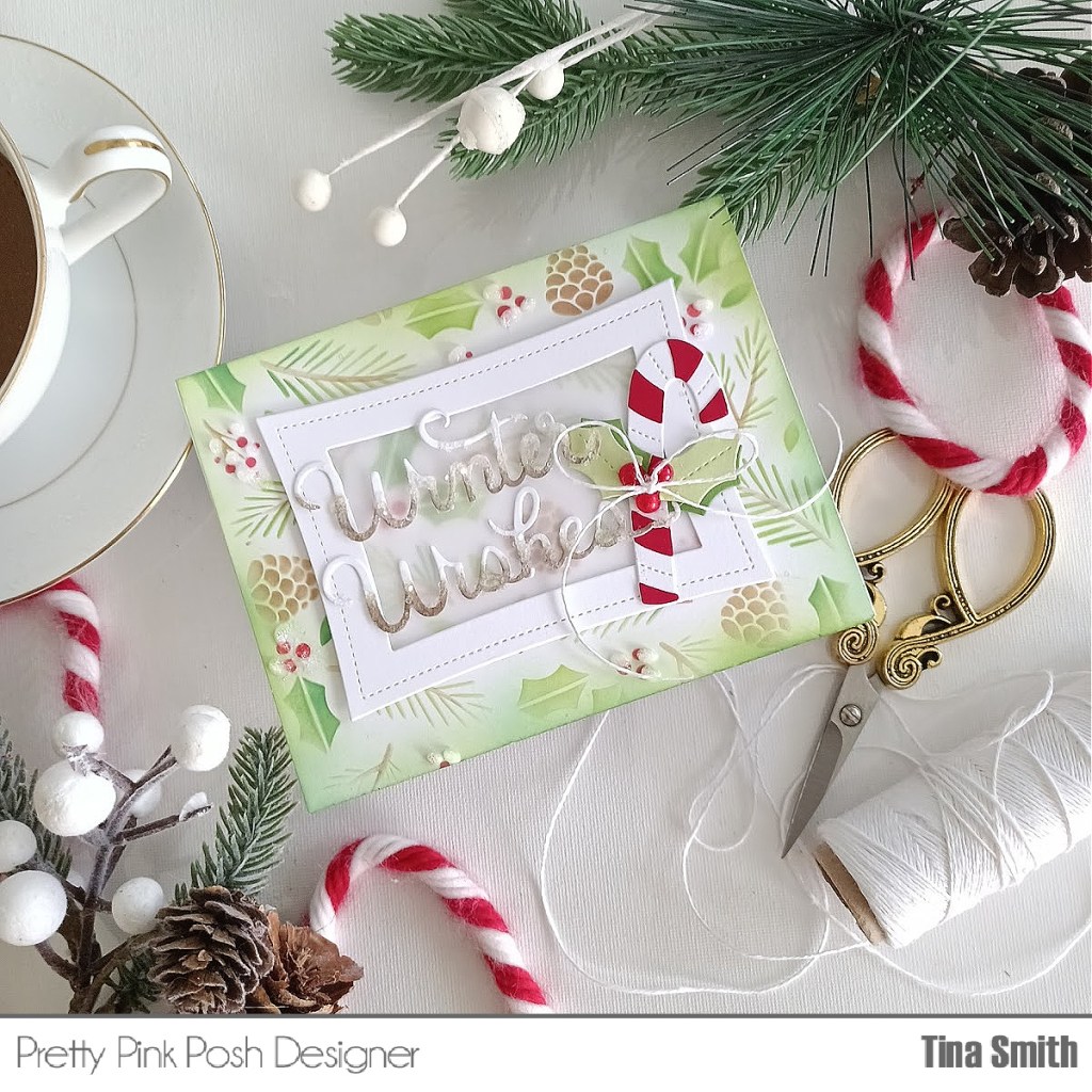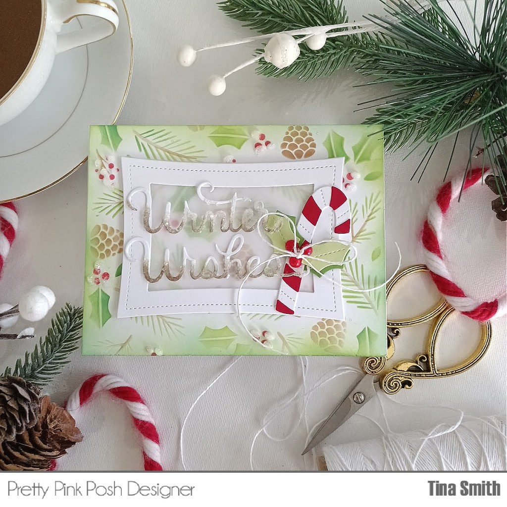 Hello Crafty Friends! I hope your having a lovely day! As the l the weather is cooling I am again inspired by the season! Today I am sharing a project for Pretty Pink Posh with the fun Layered Winter Foliage Stencil Set, the Winter Mug Die Set, the Winter Wishes Script Die. All are part of the latest release at the Pretty Pink Posh Shop, check out what’s new HERE! I created a background with lots of earthy colors and added a frame I created with the fun Wonky Stitched Rectangles Dies. I love the candy cane and the holly in the Winter Mug set and used them for a splash of color on my project today. I love how it turned out & hope you like my project!