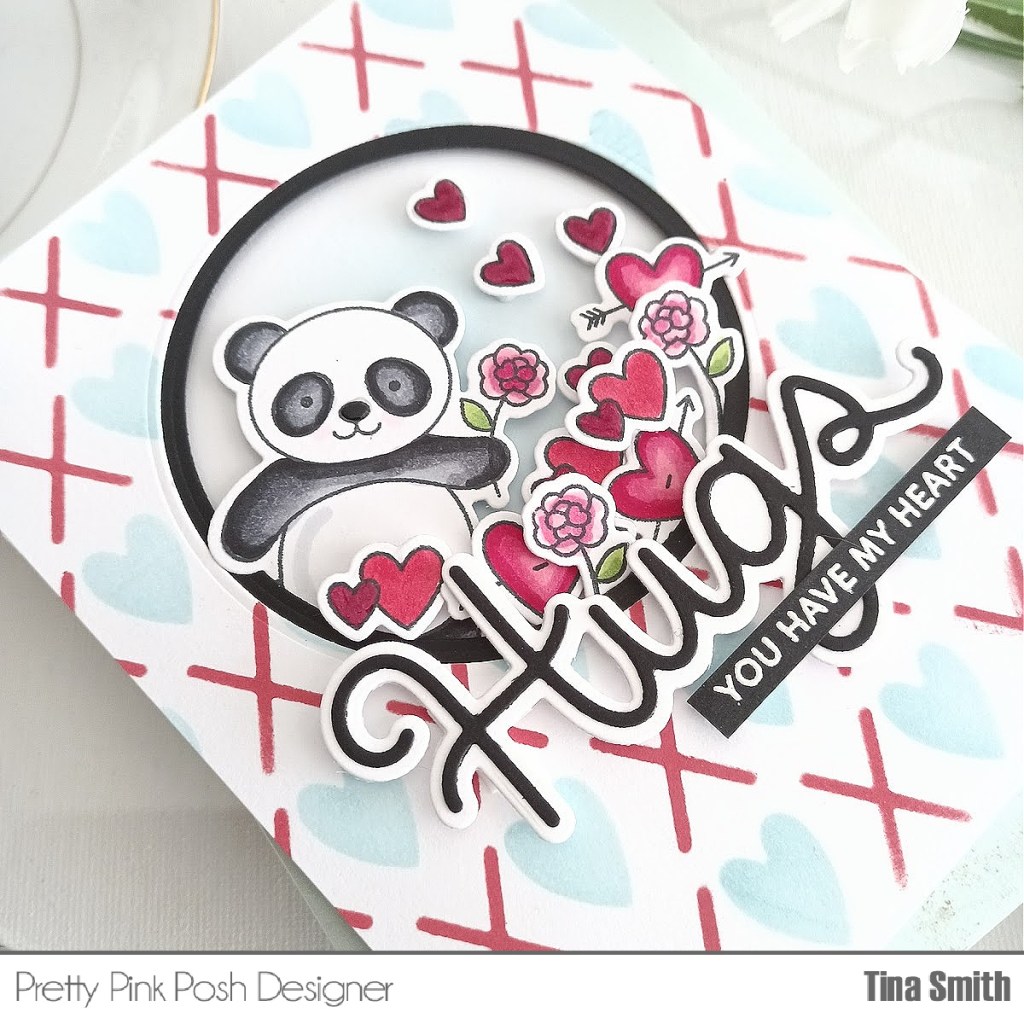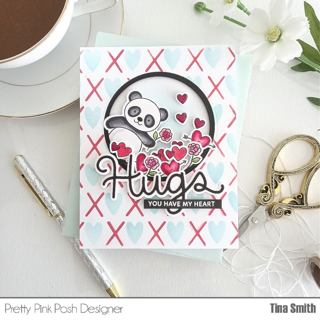 Hello Crafty Friends! I hope your having a great day! Today I am sharing a project for Pretty Pink Posh with the Heart Critters Stamp Set and Coordinating Heart Critters Die Set. Both are part of the latest release over at the Pretty Pink Posh Shop, check out what’s new HERE! I think panda’s are just adorable and thought he would look cute peeking out a circle window over flowing with hearts. For my sentiment I used the New Large Hugs Shadow Die set along with one from the stamp set. I created a hugs and kisses filled background with the New Layered XOXO Stencil set too:) I love how it turned out & hope you like my project!