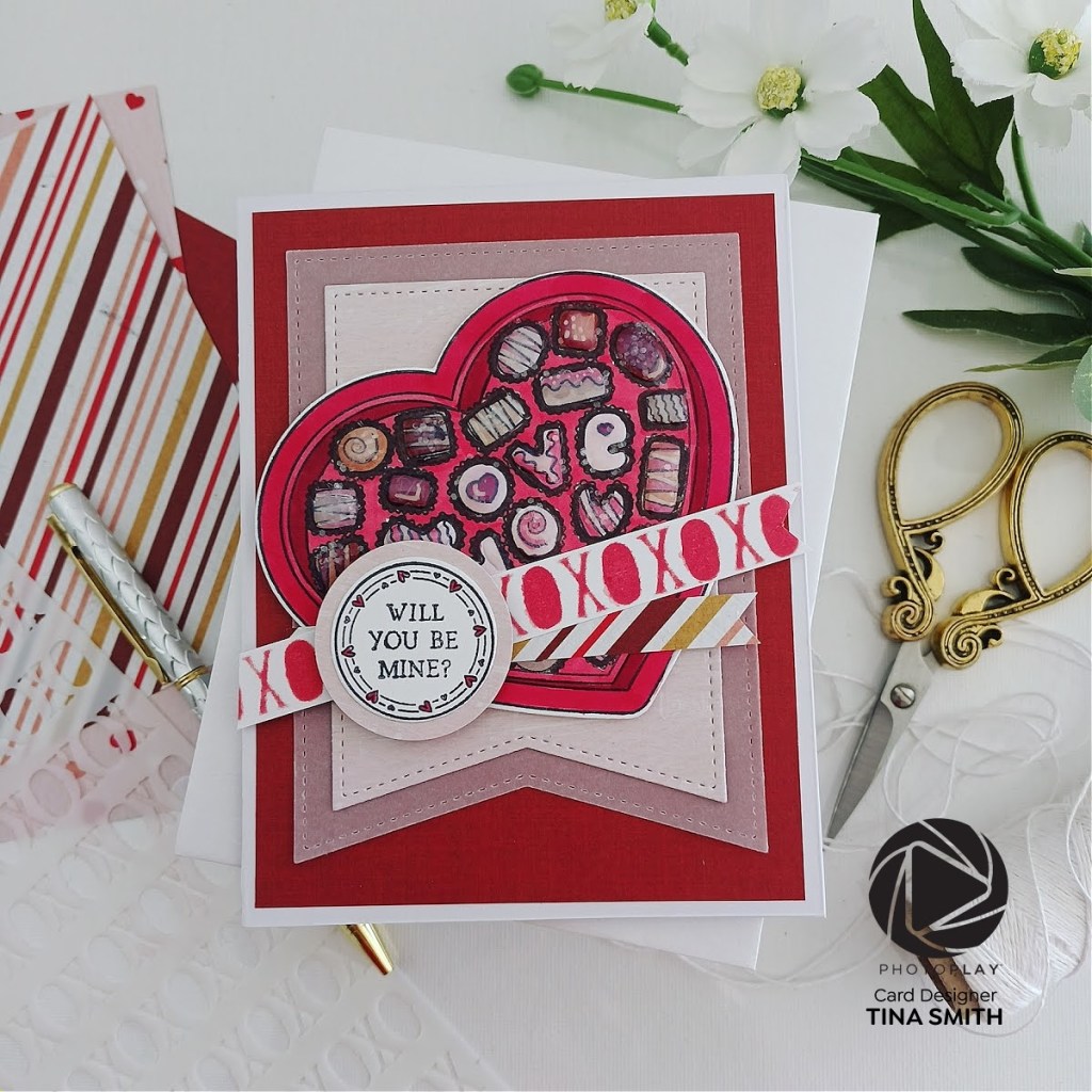Hello crafty friends. Today we are creating a delicious Valentine card! I am using a few patterned papers from the fun Cupid’s Sweetheart Cafe 12×12 Collection, the Cupid’s Sweetheart Cafe Clear Stamps the Coordinating Die set and the Cupid’s Sweetheart Cafe Stencil. A chocolate heart filled with love and has no calories, that is the best! I love how this turned out and hope you do too! Watch the tutorial down below to see how I made it:) See you next week for some more fun projects with the amazing Photoplay Paper Collections.